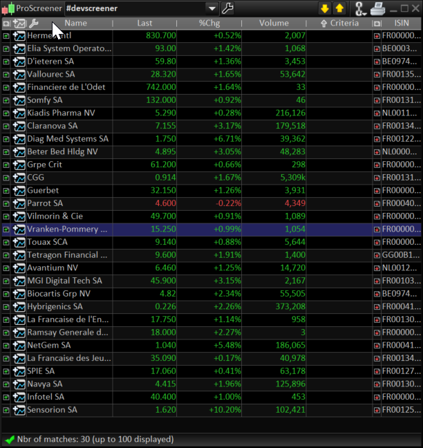 Oui effectivement je n’ai que les données de fin de journée effectivement, je comprends qu’il y ait un décalage en europe pour les marchés ouverts. Mais je ne comprends pas, même dans ce cas, pourquoi toutes ces valeurs s’affichent au regard des clôtures de vendredi. Quelles données prend-il en compte ?D’autant plus que pour les US, où les marchés actions ne sont pas ouverts, pourquoi sur la liste US Tech 150, 145 valeurs matchent avec le screener..? Merci encore et désolé