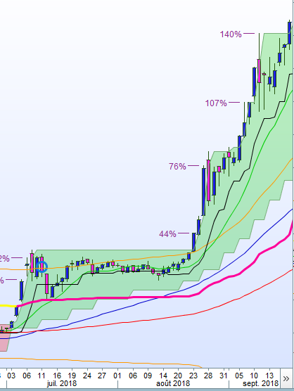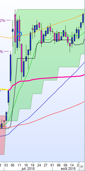 le plus haut du 09/07/16 formera la bande supérieur (verte) jusqu’au 22/08/16 soit 31 jours ouvrés et le cours s’apprête à faire son break out .