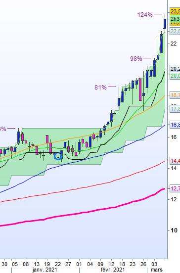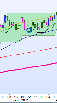 le plus haut du 06/01/21 formera la bande supérieur (verte) jusqu’au 09/02/21 soit 24 jours ouvrés et le cours s’apprête à faire son break out .
