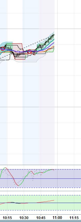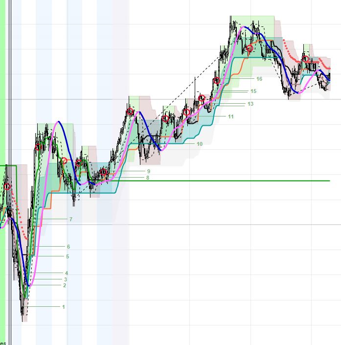 Je t’envoie 2 captures faite sur le 1mn Dax en en cours d’aujourd’hui avec les lignes à 10 points. Je l’ai faite pour la 2é salve. Le PRTBands est en vert clair et en brun. En rose, une Hull 1 heure(60), les background délimitent les quart d’heure. En bleu derrière le Following d’ExtraTrend, trés bon.