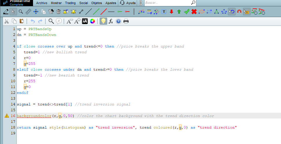 up = PRTBandsUp dn = PRTBandsDown if close crosses over up and trend<=0 then //le prix casse la bande supérieure trend=1 //tendance haussière r=0 g=255 elsif close crosses under dn and trend>=0 then //le prix casse la bande inférieure trend=-1 //tendance baissière r=255 g=0 endif signal = trend<>trend[1] //signal d’inversion de tendance backgroundcolor(r,g,0,50) //coloris le fond du graphique avec la couleur de la tendance return signal style(histogram) as “inversion de tendance”, trend coloured(r,g,0) as “direction tendance”
