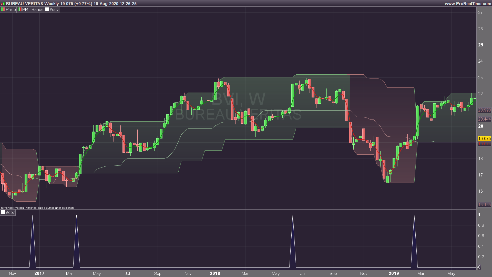 – si la tendance générale déterminée sur la base de PRTBandsUp et PRTBandsDown est haussière, alors PRTBandsShortTerm est rouge ou verte suivant qu’elle est haussière ou baissière.