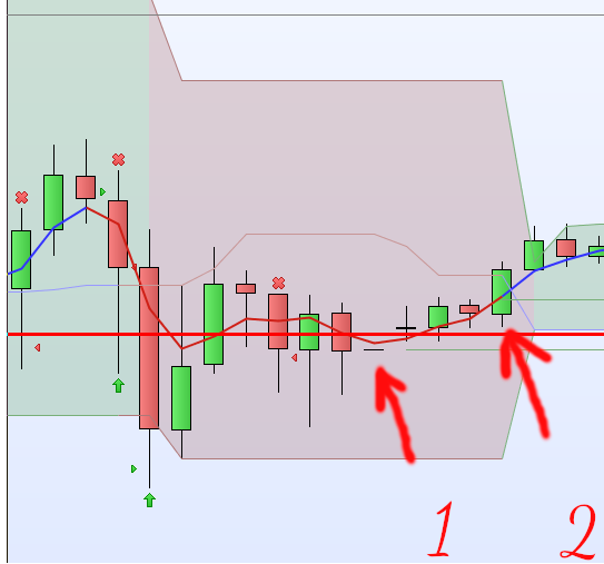 // Buy if not on market and trend is green and Close crosses over PRTBANDSMEDIUMTERM after X candles below