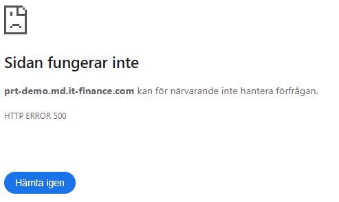 When starting PRT by the yellow arrow i get a new window saying that the page doesnt work, HTTP error 500, and that “prt-demo.md.it-finance.com cant handle my request at the moment”
