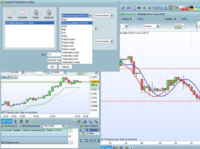 My chart has a very basic ‘Moving Average’ indicator which I have setup two on the chart with different settings. Now when I go to the back test function, I want to setup a ‘Buy’ when MA2 crosses over MA1, and then ‘Sell’ when MA1 Crosses under MA2. And Vice Versa for the ‘Short’ positions.