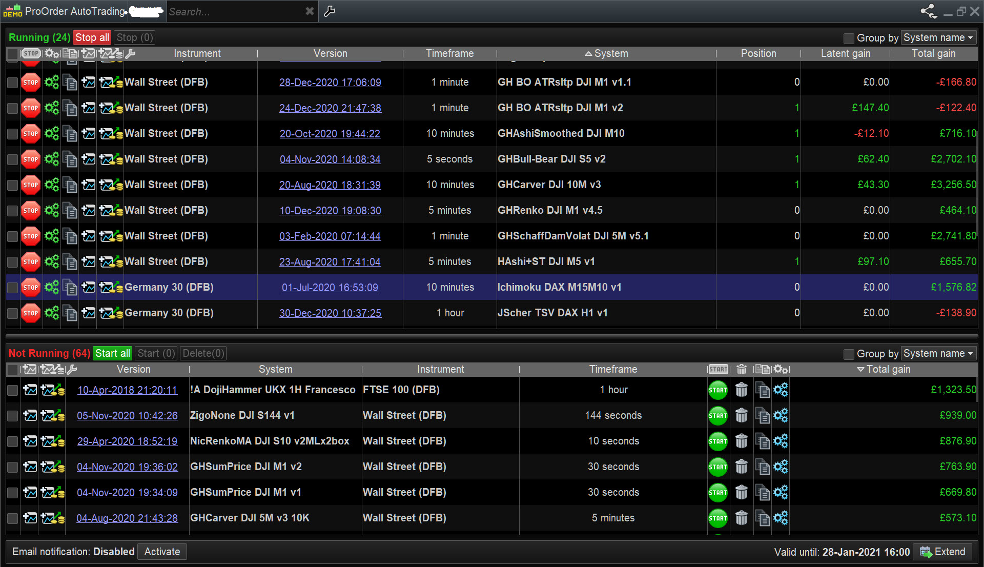 4) The window showing which strategies you have running is now so badly laid out it’s almost unreadible. Nice neat windows in v10.3 are now columns only a few milimeters wide with unreadible text. Useful parts like ‘running’ or not running are gone.