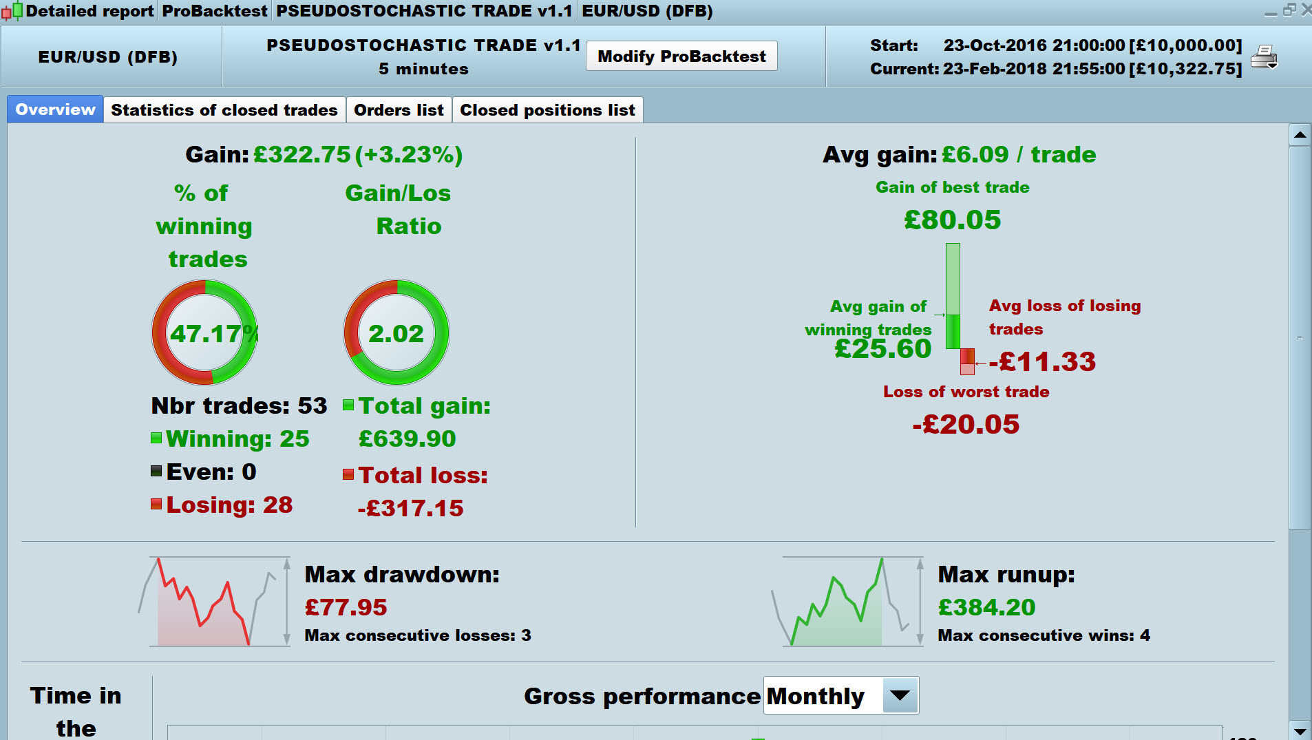 Attached V1.1 on eurusd @ 5 min over 100k bars @ £1 per point SB