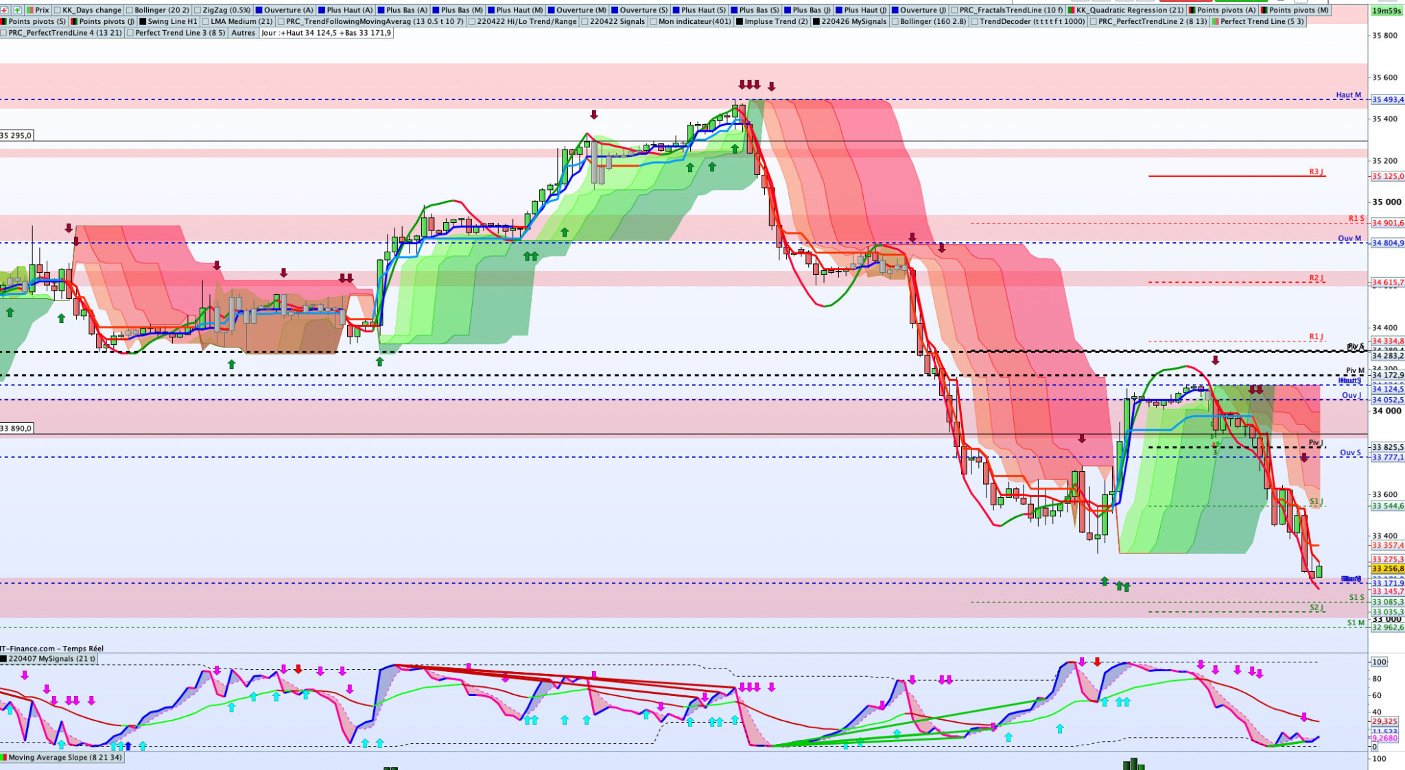 On peut utiliser Perfect Trend Line en superposant l’indicateur sur plusieurs périodes (5/3, 8/5, 13/8, 21/13, etc.) comme indiqué sur le graph (Dow H1) ci-dessous. Je trouve que cela donne des signaux pertinents. Si tu souhaites attendre une confirmation, alors tu augmentes la valeur des périodes (8/5, 13/8, 21/13, 34/21, etc.)