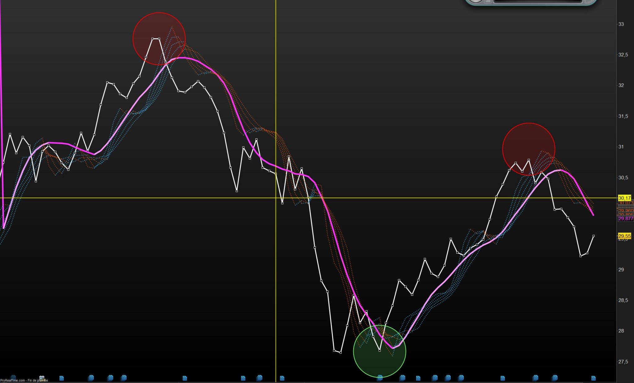J’ai essayè le resserrement des moyennes en utilisant la suite de Fibonacci : 3 5 8 13 21 34 55 etc et des moyennes simples