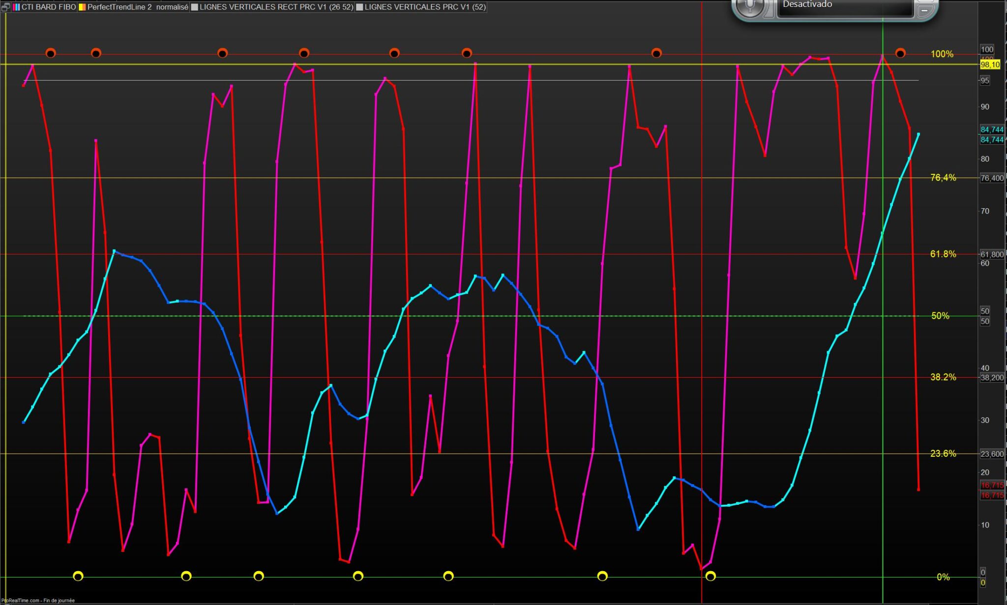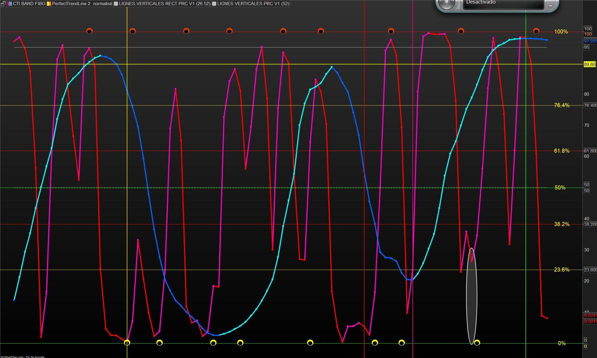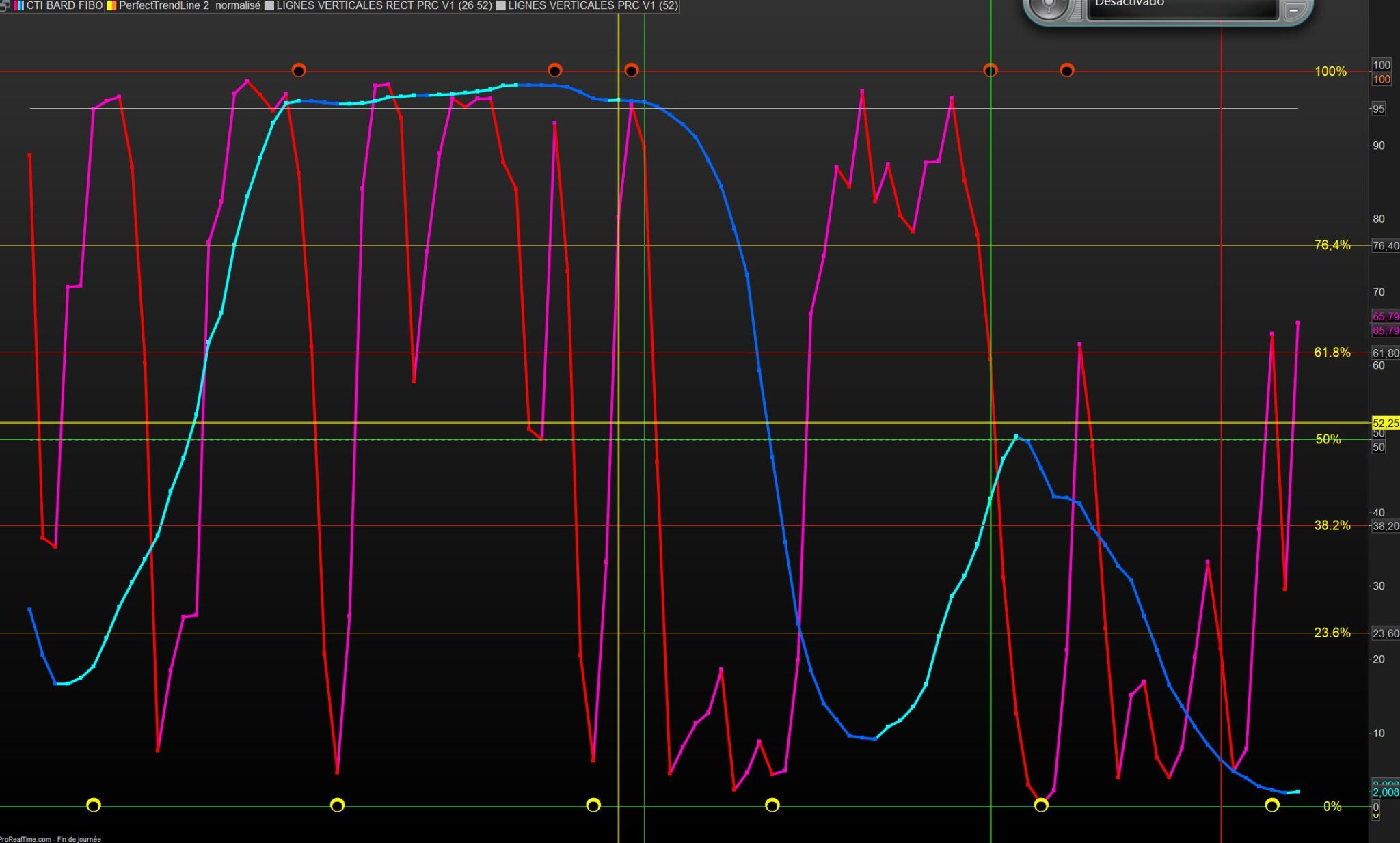 Voici quelques illustrations avec le Perfect trendline normalisé sur un CTI court et moyens termes , les bandes verticales vertes et rouges sont les derniers plus hauts et plus bas.
