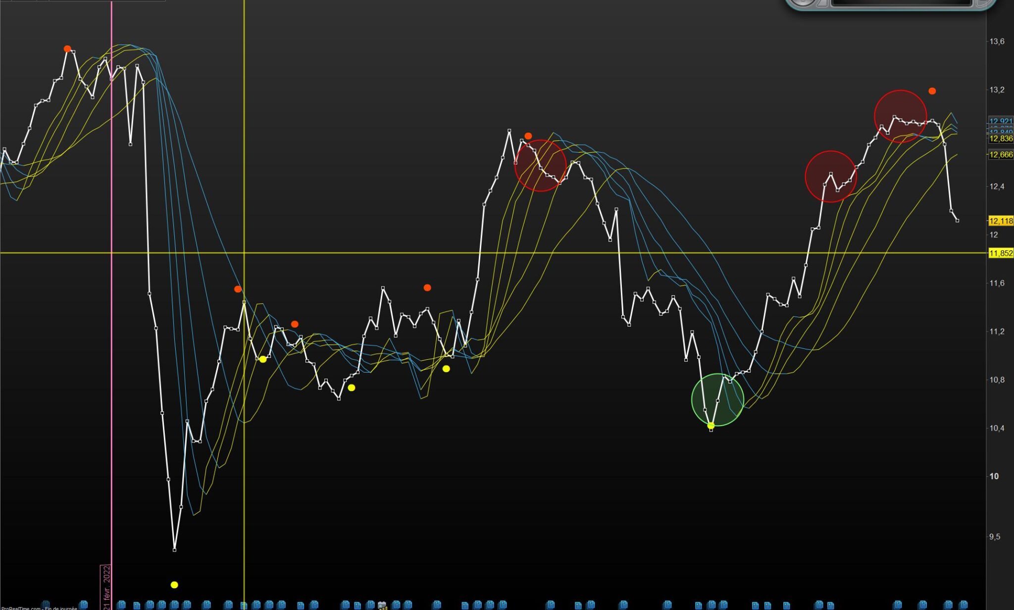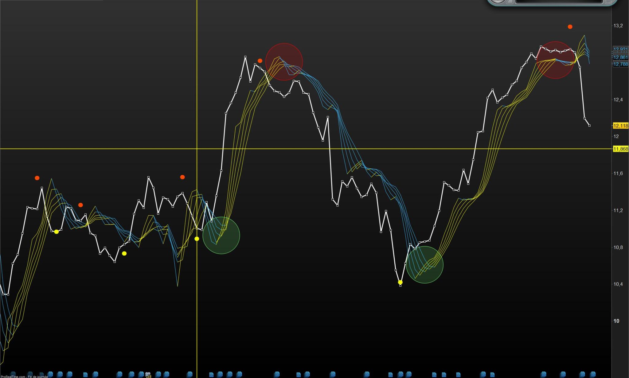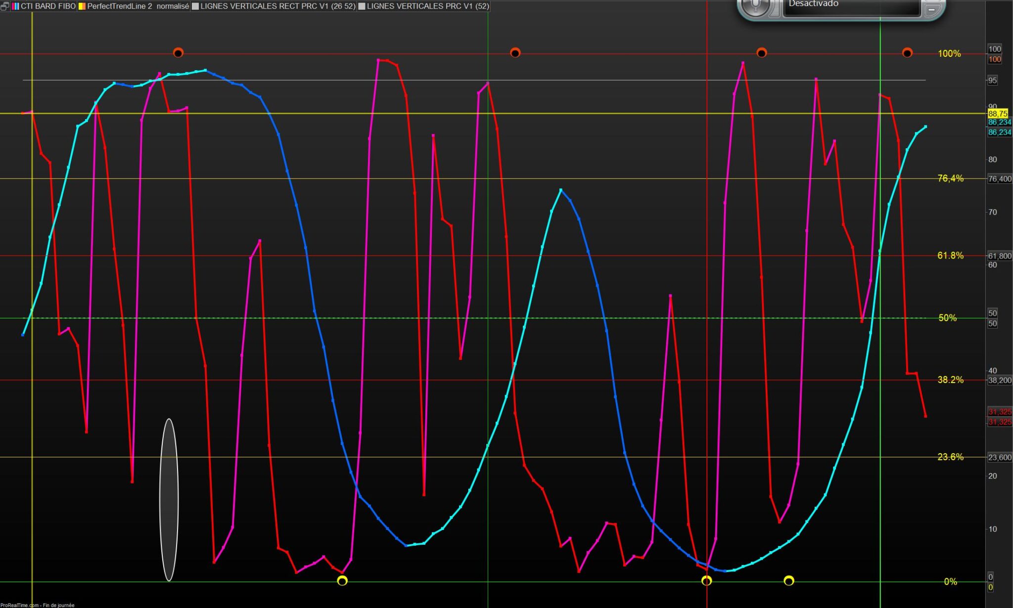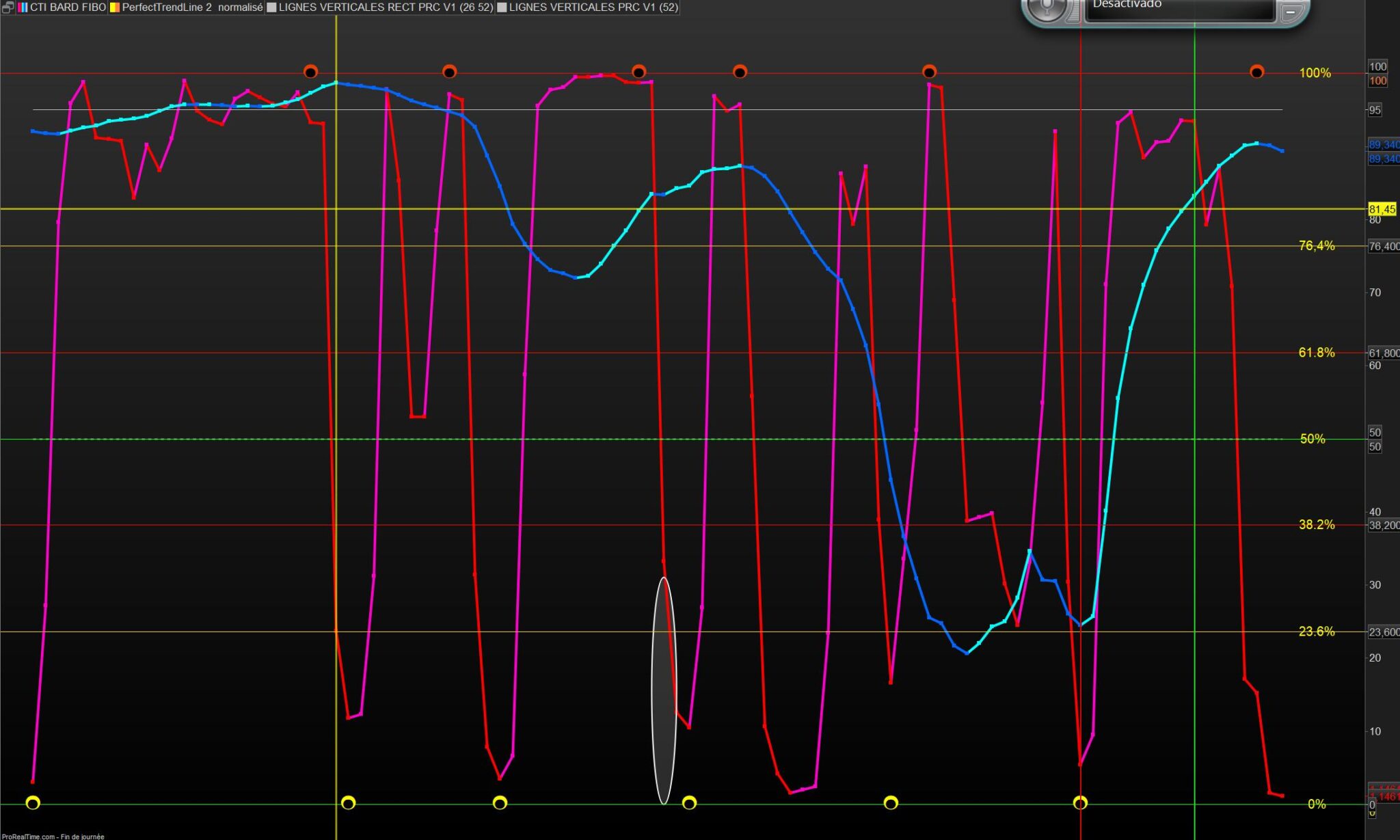 Voici quelques illustrations avec le Perfect trendline normalisé sur un CTI court et moyens termes , les bandes verticales vertes et rouges sont les derniers plus hauts et plus bas.