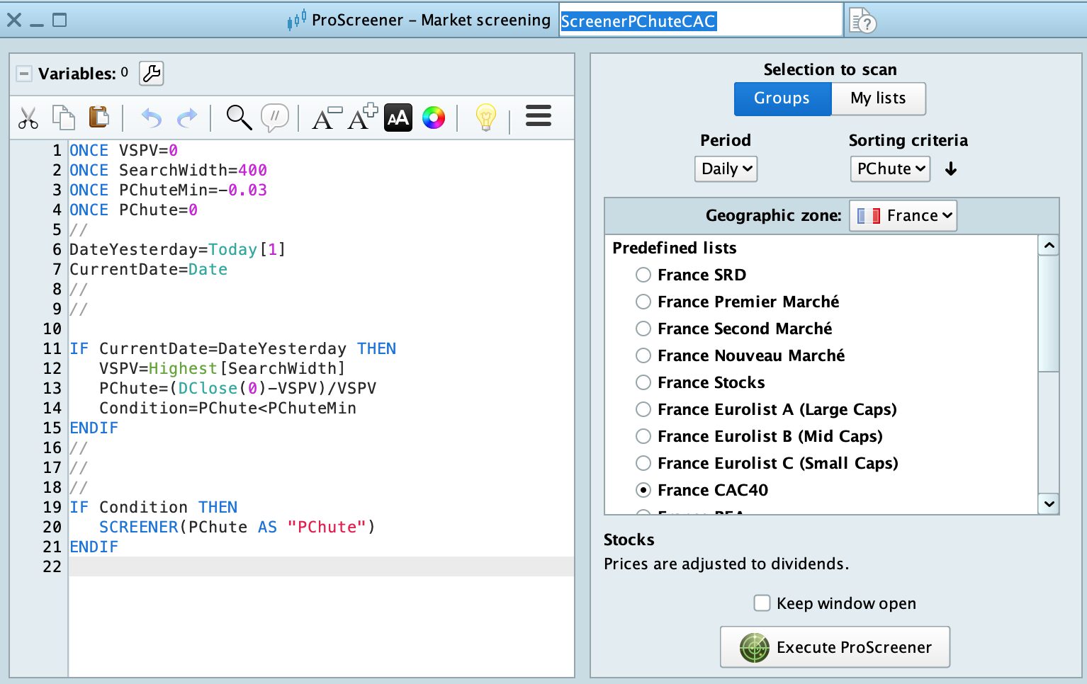 Bonjour, j’essaie de faire tourner un Screener simple, qui me notifie toutes les valeurs du CAC qui ont baissé d’un certain seil mini (ici -3%) par rapport à leurs plus hauts de 500 séances. Alors que le code fonctionne sans problème comme indicateur, il m’est refusé comme Screener au motif que je n’aurais pas l’accès temps réel au marché (ce qui je penser est faux, et en plus j’ai essayé de coder mon Screener afin qu’il ne tienne compte que des données de la veille au plus tard). Des idées ?