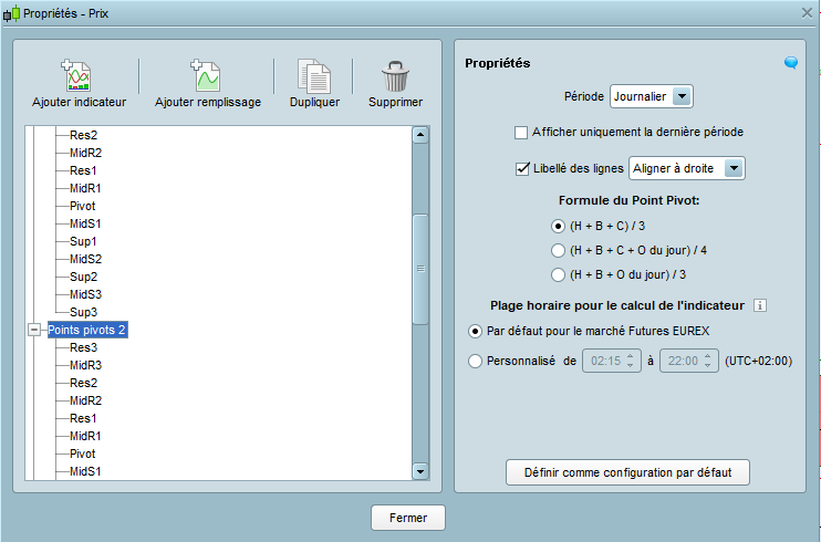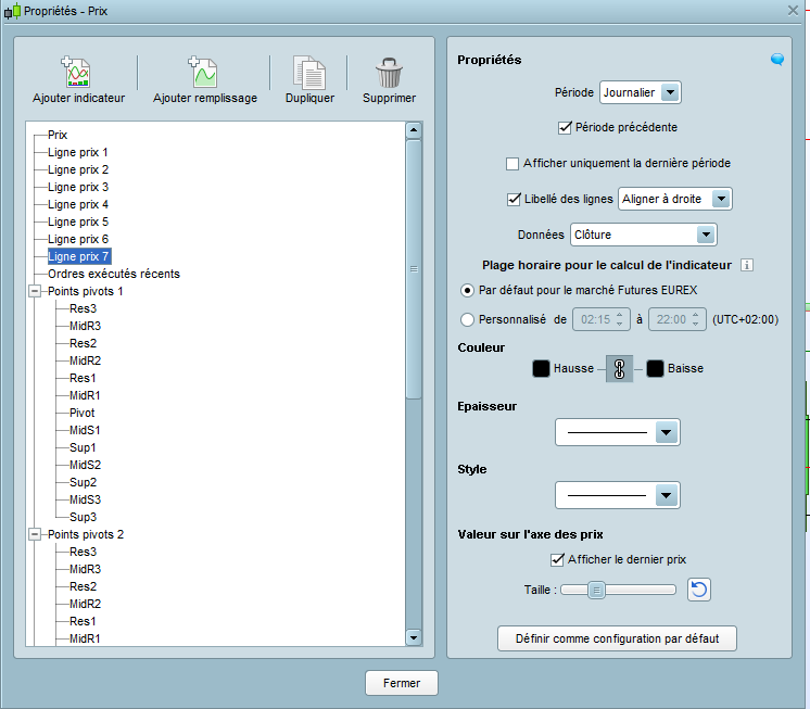 Quels sont les paramètres de l’indicateur de points pivots ? Le problème est-il identique sur d’autres contrats Futures (CAC40, FTSE) ?