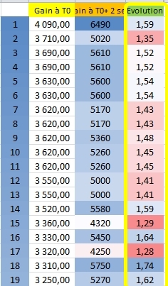 La bonne c’est qu’il y a de sérieuses pistes permettant d’avoir un certain “Graal” = de créer des licornes comme visible sur les images. A savoir une progression P qui puisse globalement être corrélée avec le classement à T0 et une progression P élevée. Par exemple sur cette combinaison les 20 premiers du classement ont progressé/gagné 35 à 74 % (Valeur de P) ! et c’est constant et reproductible !. Sur les 50 premiers résultats, 98 % étaient en gain après 15 jours=période OOS et 88 % avait une progression d’au moins 30 % avec une moyenne de 47,2 % ! (Clairement c’est trop, mais la bonne nouvelle c’est que c’est ajustable)
