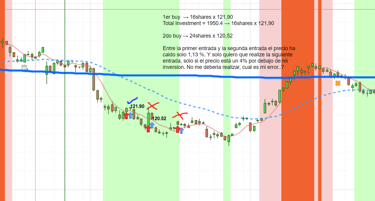 Entre la primer entrada y la segunda entrada el precio ha caido solo 1,13 %. Y solo quiero que realice la siguiente entrada, sólo si el precio está un 4% por debajo de mi inversión. No me debería realizar esa 2da compra, cual es mi error..? A continuación, un resumen de mi código.