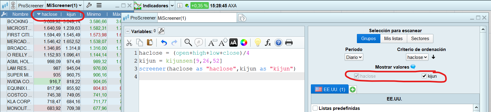 screener (haClose as “haClose”, kijun as “kijun”)