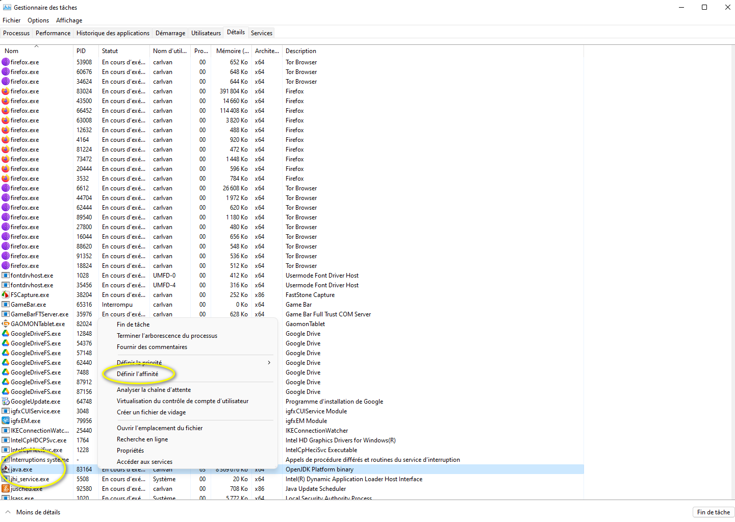 Dans mon cas, je n’ai pas de ralentissement observable car j’ai 32 Gb de RAM, par contre, effectivement, la v12 utilise énormément de ressources processeur, ce qui avec mon PC se traduit par une augmentation incessante de la température du CPU, automatiquement compensée par une accélération du ventilo. Il faut dire que j’ai pas mal de graphiques ouverts, pas loin de 20 avec à chaque fois plusieurs indicateurs. Ma machine ressemble donc à une turbine d’Airbus régulièrement. J’ai trouvé une solution, en attendant que les programmeurs rectifient dans une prochaine version: aller dans gestionnaire de tâches (Windows), “processus”, isoler l’application (“OpenJdk Platform Binary”), click droit et sélectionner “détails”, re-click droit sur “java.exe”, puis sélectionner “définir affinités”, et là désélectionner quelques sous-processeurs: ils sont tous sélectionnés par défaut, dans mon cas 7, vous pouvez essayer par exemple avec un seul coeur sélectionné. Votre PC va immédiatement se calmer et respirer, mais c’est au prix d’un ralentissement de PRT, les graphiques sont plus lents, ainsi que le calcul des indicateurs. Moi, j’utilise cette technique quand je consulte les graphes mais ne trade pas. Avant de trader, je remets les 7 coeurs de bobonne en route, et l’avion redécolle…