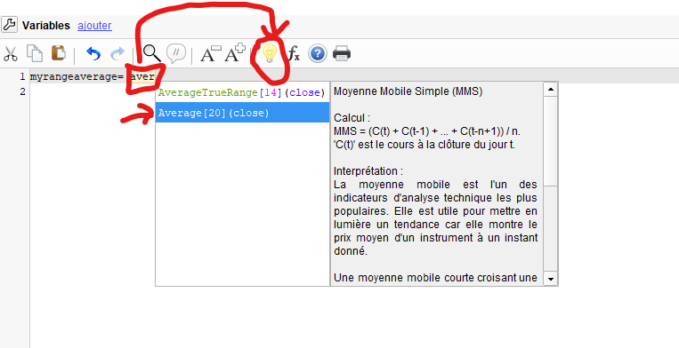 By the way, in the wake of yesterday’s “tip”, another tip to avoid such parentheses issues and save you time not having to find the problem and solve it: typing the start of the keyword (for example “aver” for average), and clicking in toolbar on the yellow lightbulb, it will propose all language keywords with “aver” inside, then click on the one wanted in the list and it will complete “aver” in your code, in this case “average[20](close)”, now that syntaxt is ok, replace 20 if needed, replace close if needed.