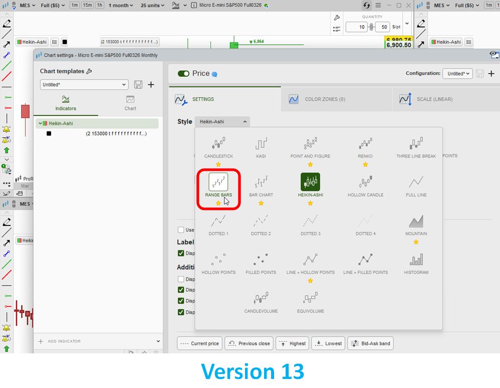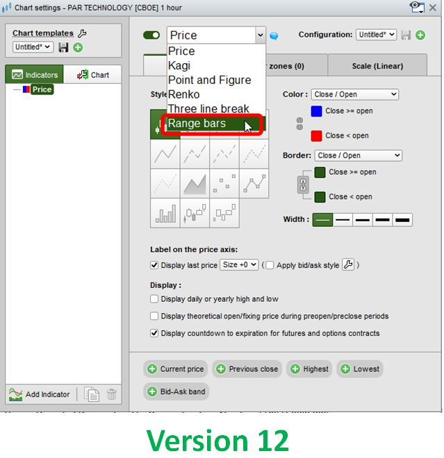 Not to sound dumb but setting the Range Bars to Price just makes it a regular Candlestick again? It removes the option/setting to make the “candlestick that is not a candlestick but a Range Bar” a 50 point Range CANDLESTICK Bar? Or am I missing something? I would like a 50 point Range Candlestick not a 50 point Range Stick with left and right opening and closing markers. Thanks!