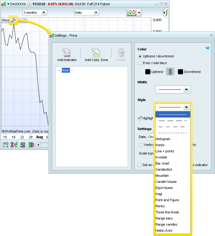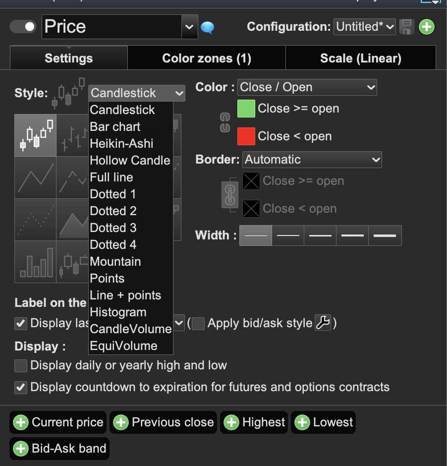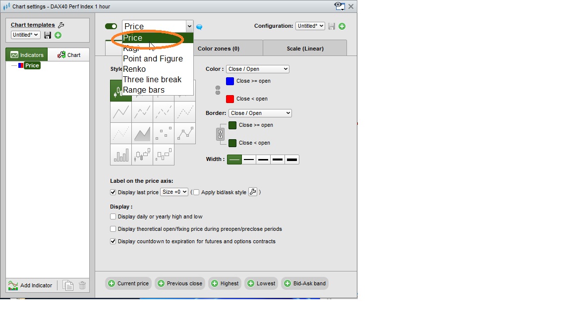 In the window, you can choose between “Bar chart” and “Candlestick” (next to “Style”)…