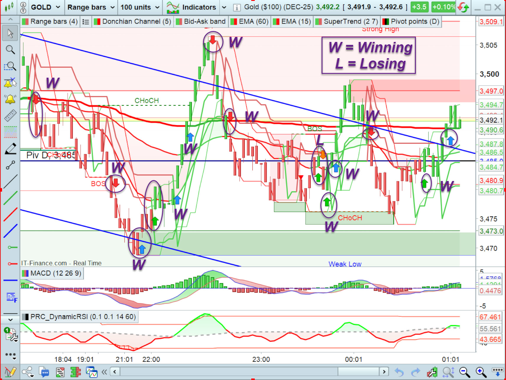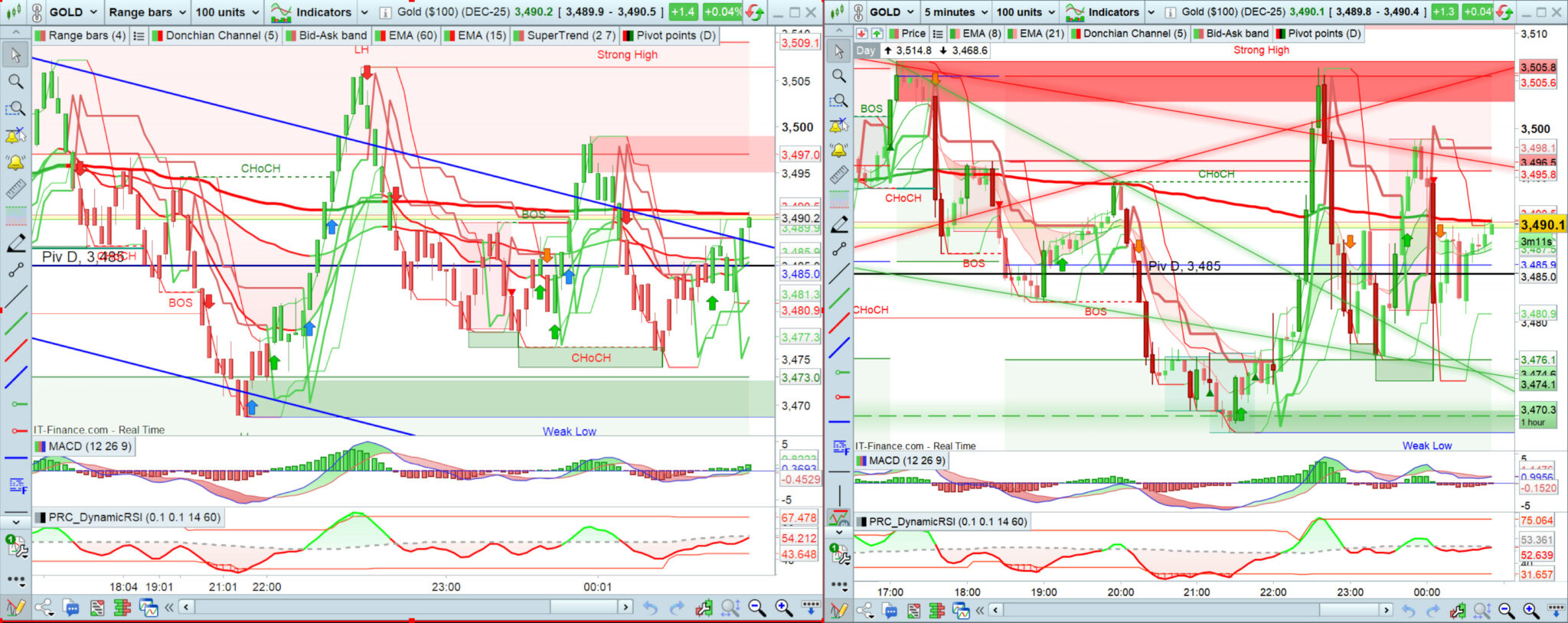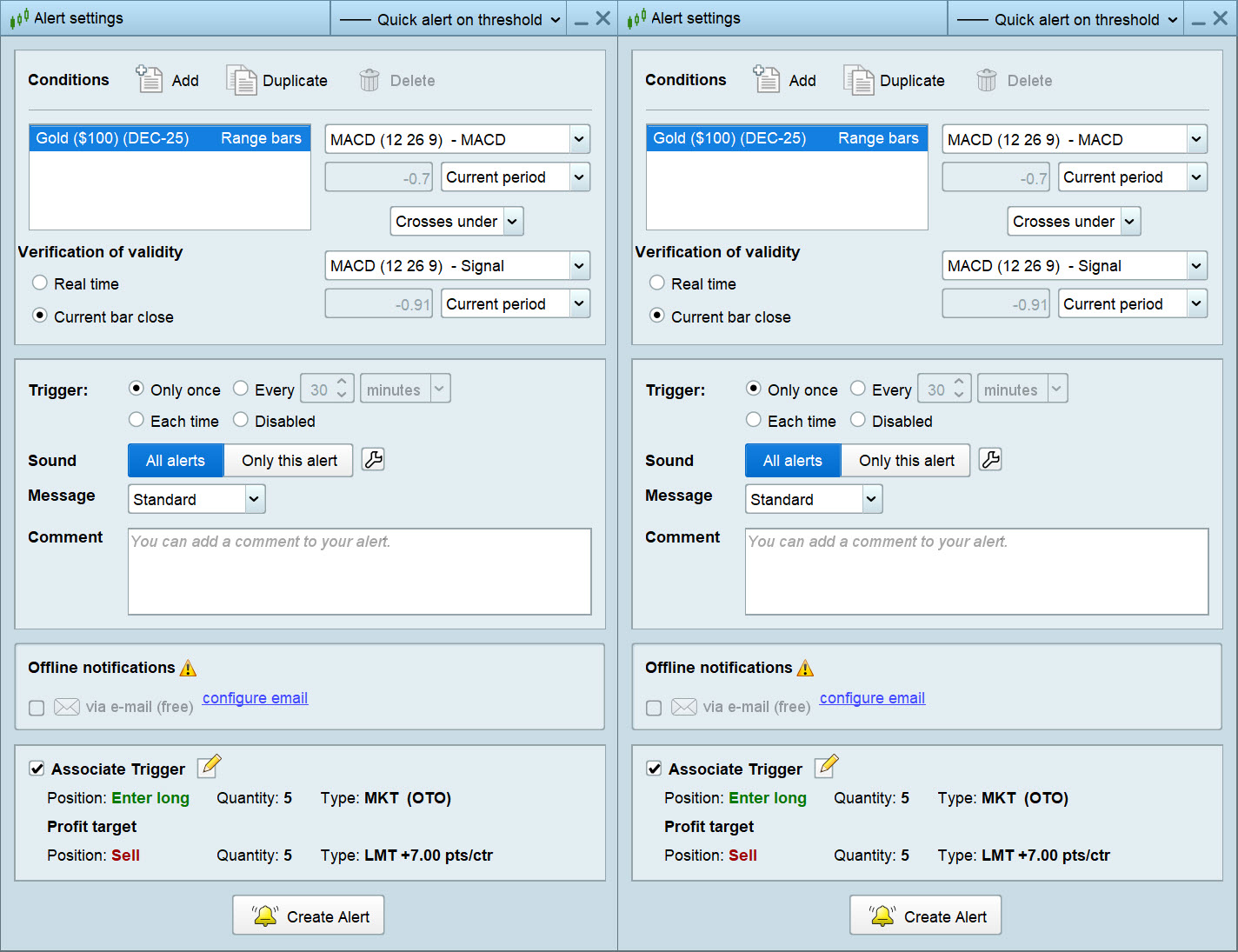 Please, see attached 2 charts for gold futures same time one is range bars 4 points per bar and the second is 5min chart. Can you imagine how easy to Auto trade (if available) the range bars compared to the 5min chart, this is so important for day traders. PRT has to provide Auto trading on range bars charts.