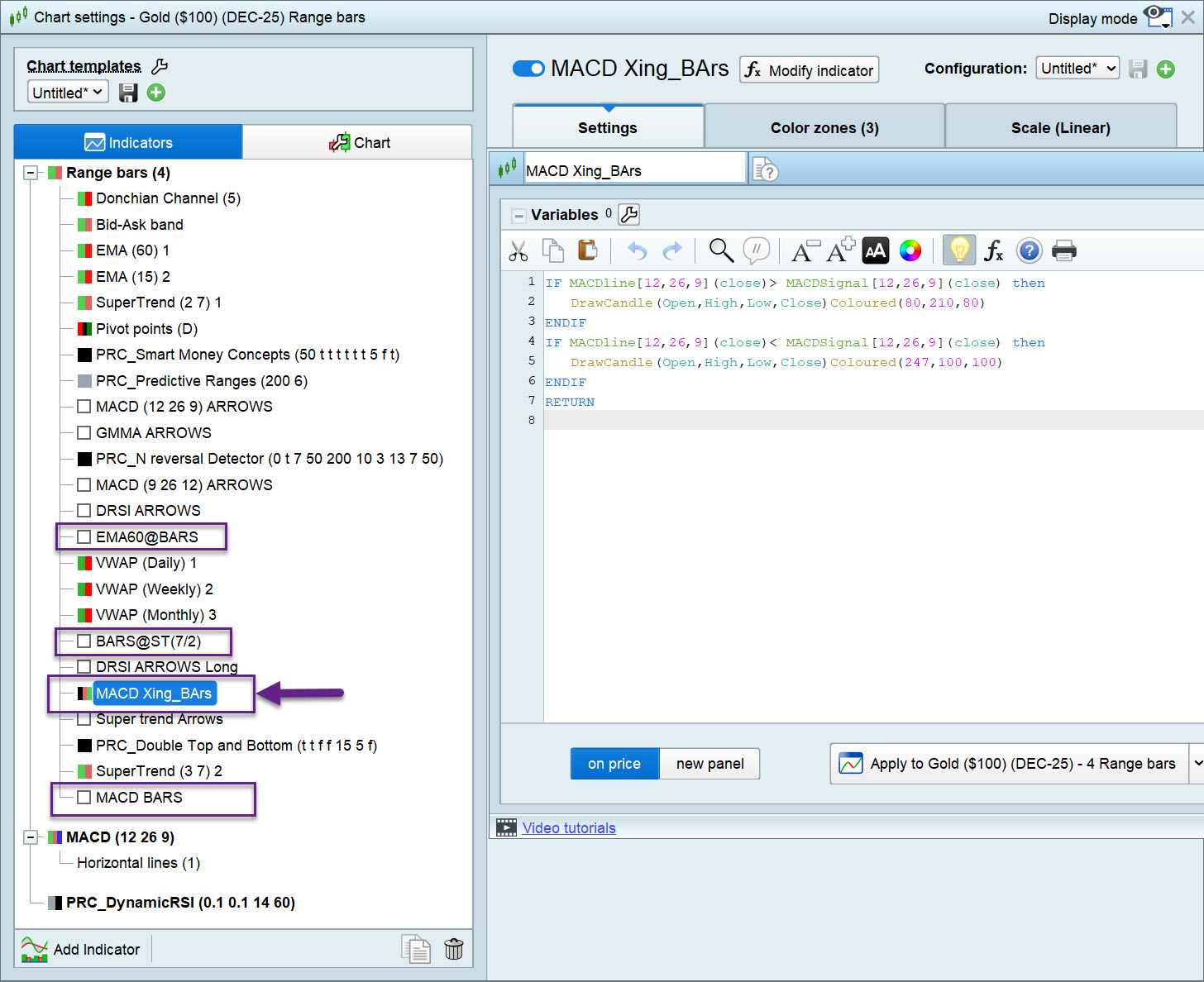 I think I’ve answered my own question … as you have no chart time period selected (Range bars on chart) then the modified MACD, SuperTrend and EMA60 can only be based on the periodicity / count of Range bars?