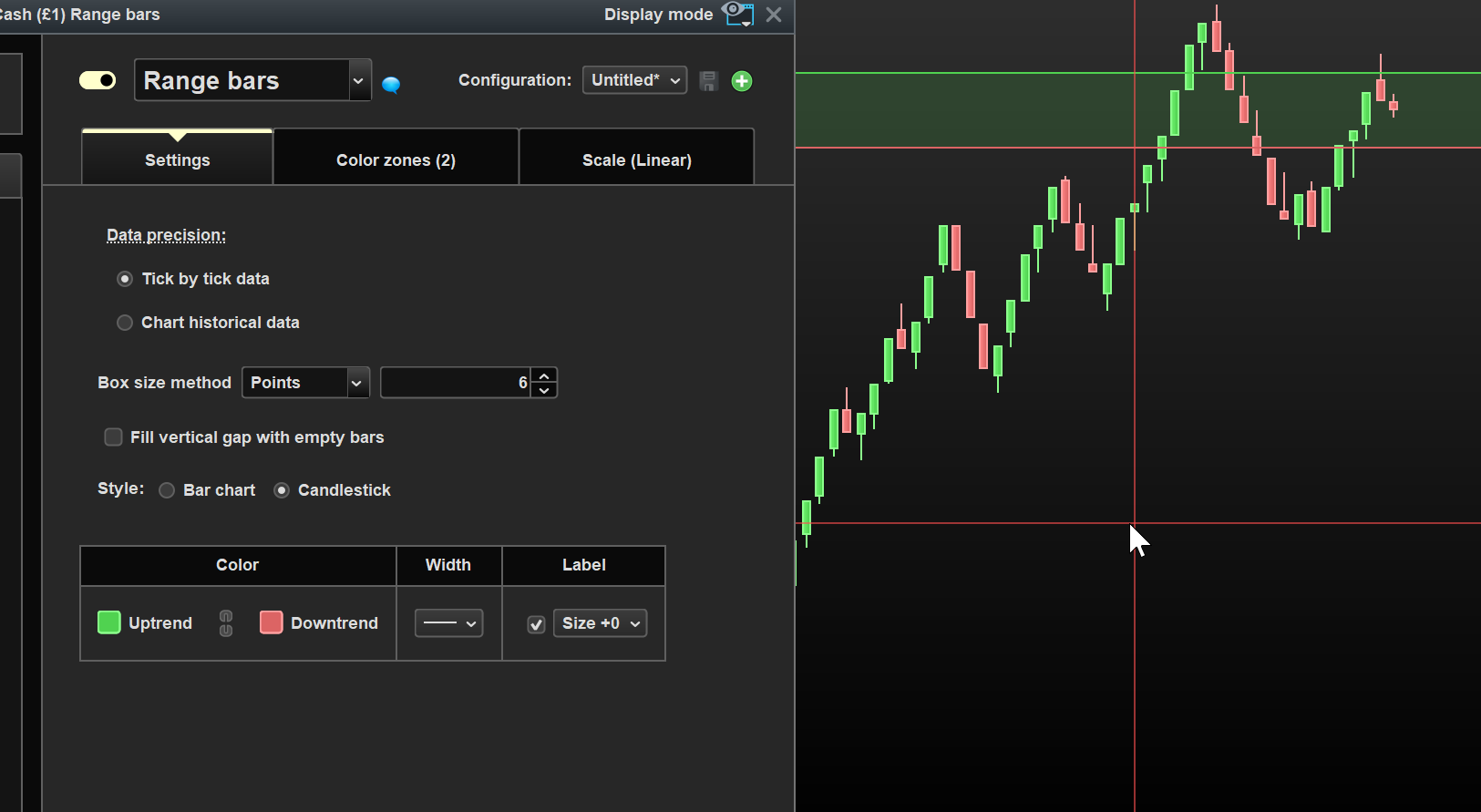 On the Range Bars chart … how have you managed to get all the bars grouped / shown as either green or red … green even for bars in a (minor) downtrend and red bars even in uptrend.