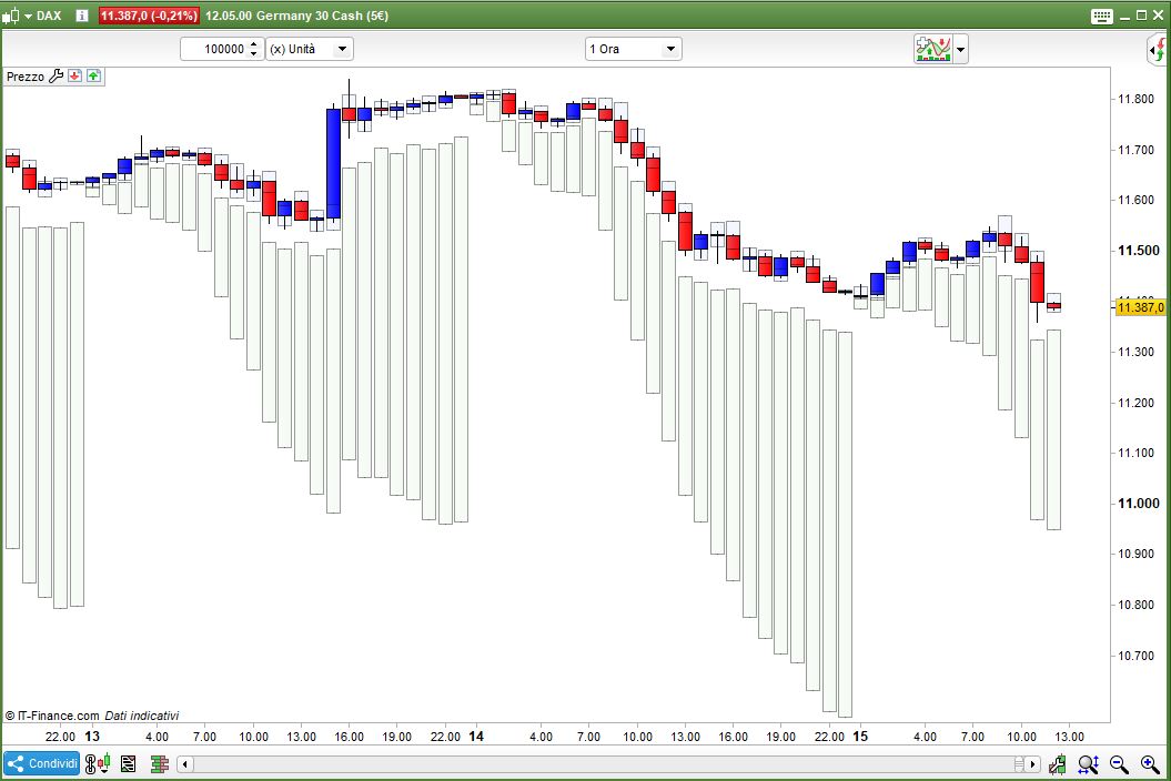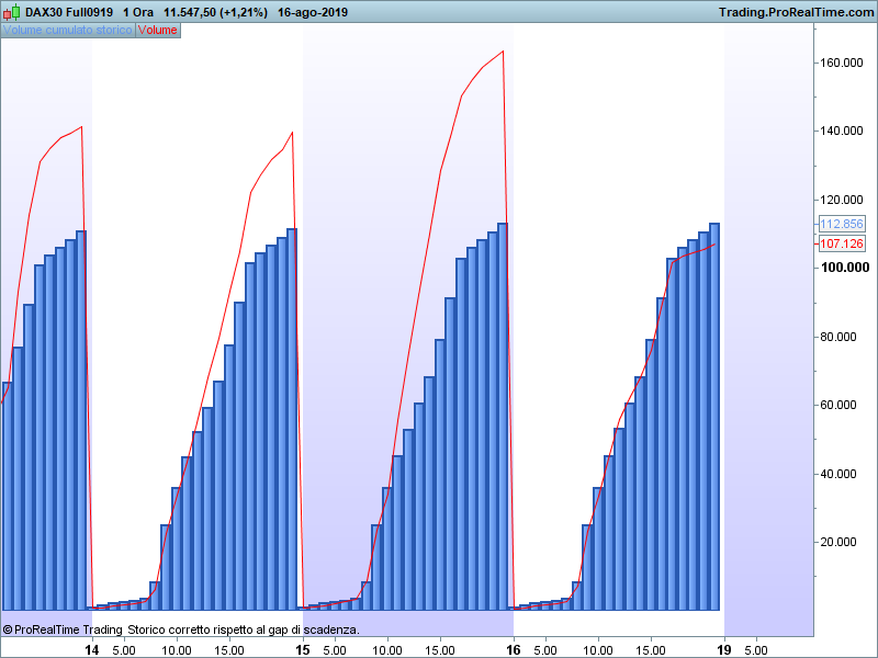 quello della prima ora, ti allego un grafico esemplificativo relativo quello al volume cumulato storico che confronto con quello giornaliero. Vorrei ottenere qualcosa el genere per capire se la giornata si sta sviluppando ad ampio range vs a range ridotto rispetto allo storico. Grazie