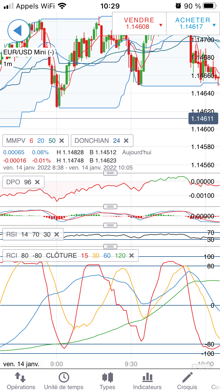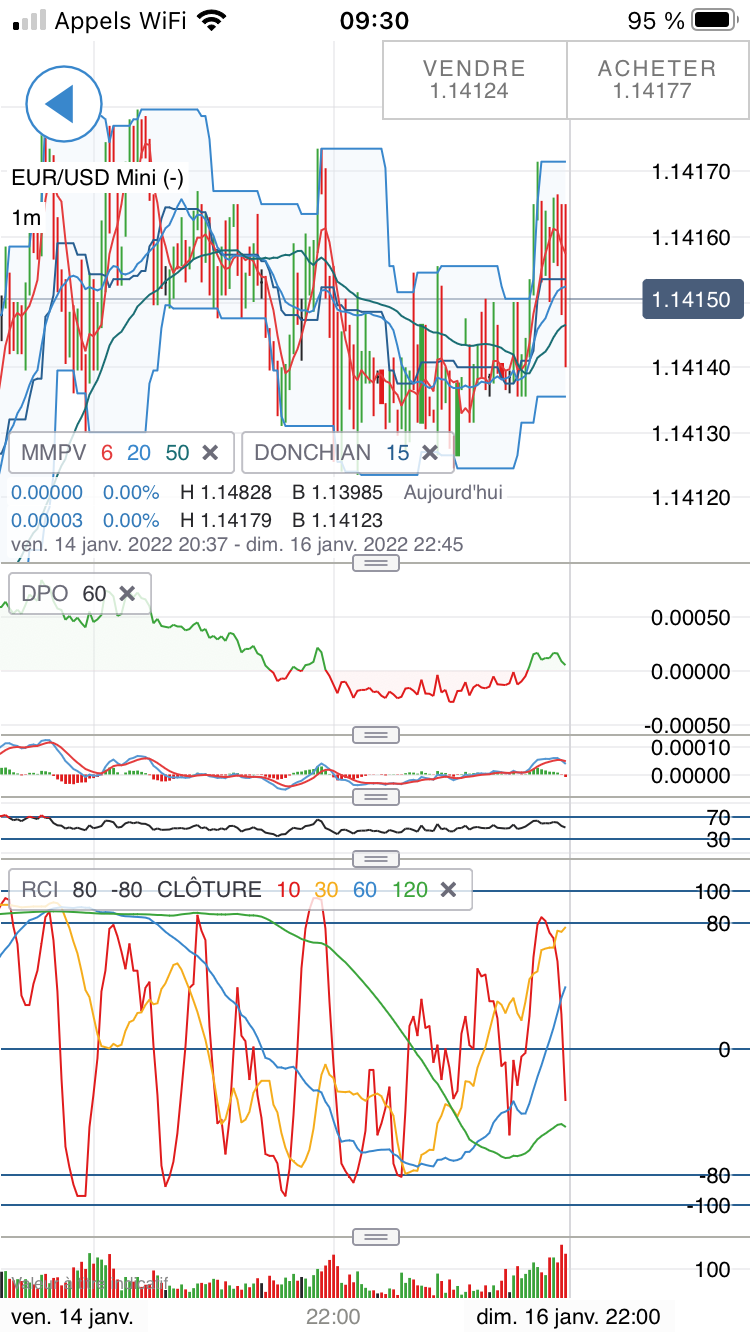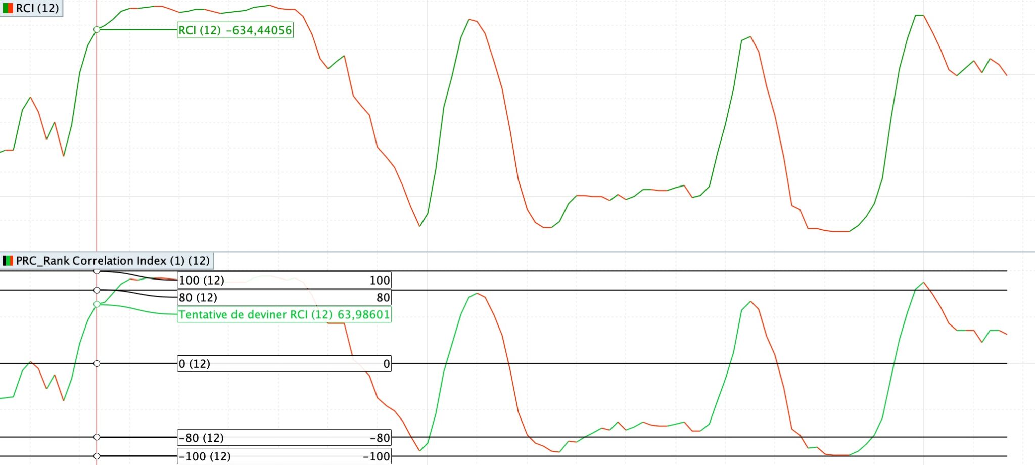 En prenant comme double série de rangs d’un échantillon n, le rang des barindex d’une part, et le rang des close d’autre part, ça donnerait le programme ci-après, mais attention, juste parce que le résultat semble borné ne signifie pas que c’est la bonne réponse. Je ne suis pas parti d’une certitude sur “d” dont je n’ai pas trouvé la définition, j’ai ici juste tenté de deviner non seulement ce que pourrait être “d” via la somme des “di” au carré, mais aussi avec quelle double série de rangs auraient été calculés ces di. Si ça montre le même résultat que ce que tu obtiens sur IG, alors ce serait deviné correctement, ou presque si proche. Mais si le résultat est différent, on en revient au chaînon manquant de départ: savoir à quoi correspond “d” dans la formule math du lien [ 1-6d/n(n2-1) ] x 100. Bref, en toute prudence, n’étant pas familier du RCI (exemple sur image attachée EurUsd 1mn ligne rouge correspondant au paramètre len = 10 ):