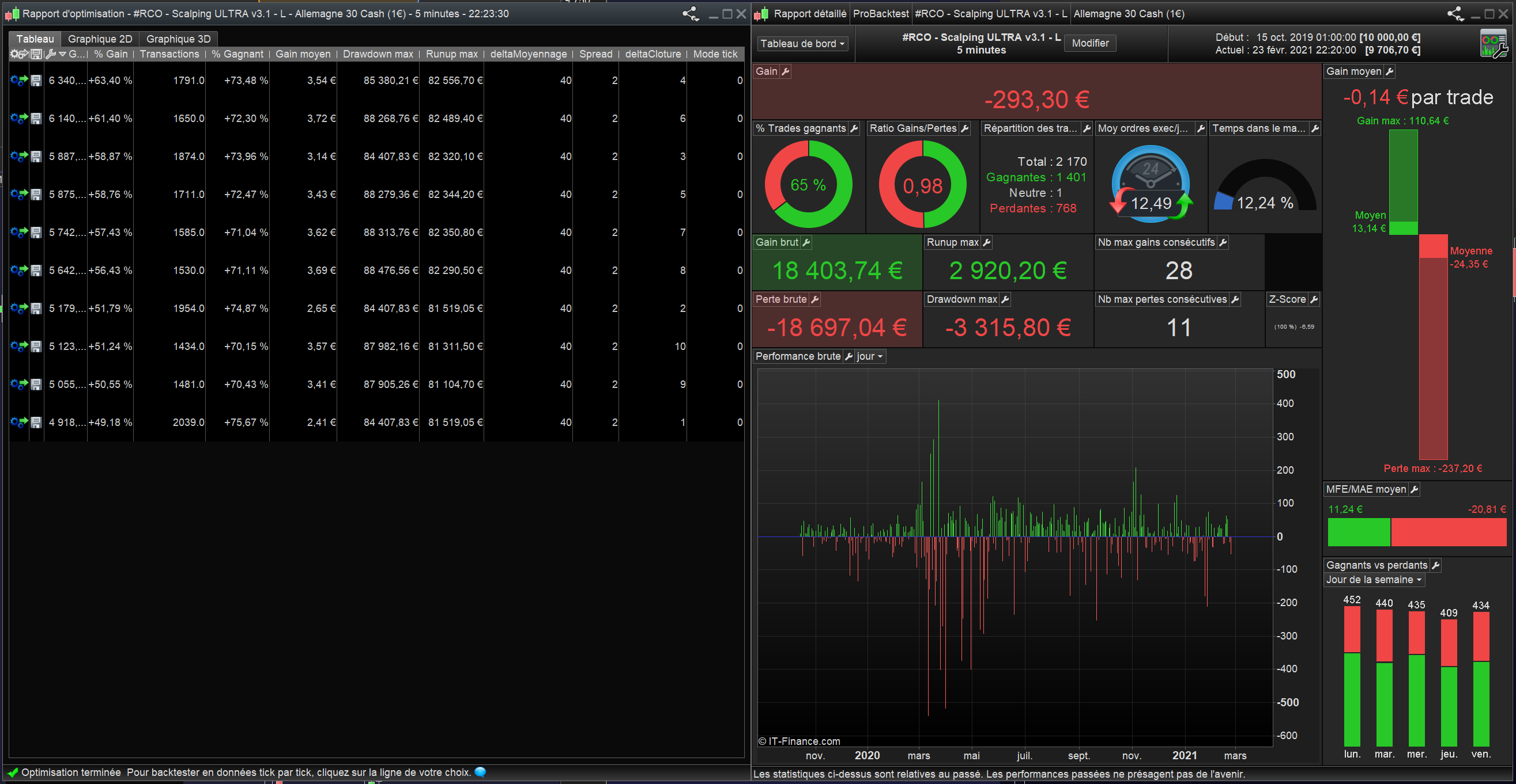 Je passe de 6340 euros de gains à 293 euros de perte … bon ok … mais le Drawdown max (85 380,21€) et le Runup max (82556,70€) sont délirants … comparé au rapport détaillé Drawdown max (3315,80€) et le Runup max (2920,20€) …