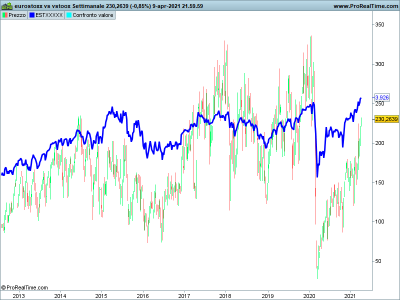 Salve, avrei necessità di rapportare i due indici eurostock e il suo indice di volatilità vstock quindi: close eurostock / close vstock, con il “valore” scaturito da questo rapporto, applicarvi sopra altri indicatori (che immagino io sappia fare da me) come ad esempio bande bollinger etc come posso fare ad avere questo valore scaturito?