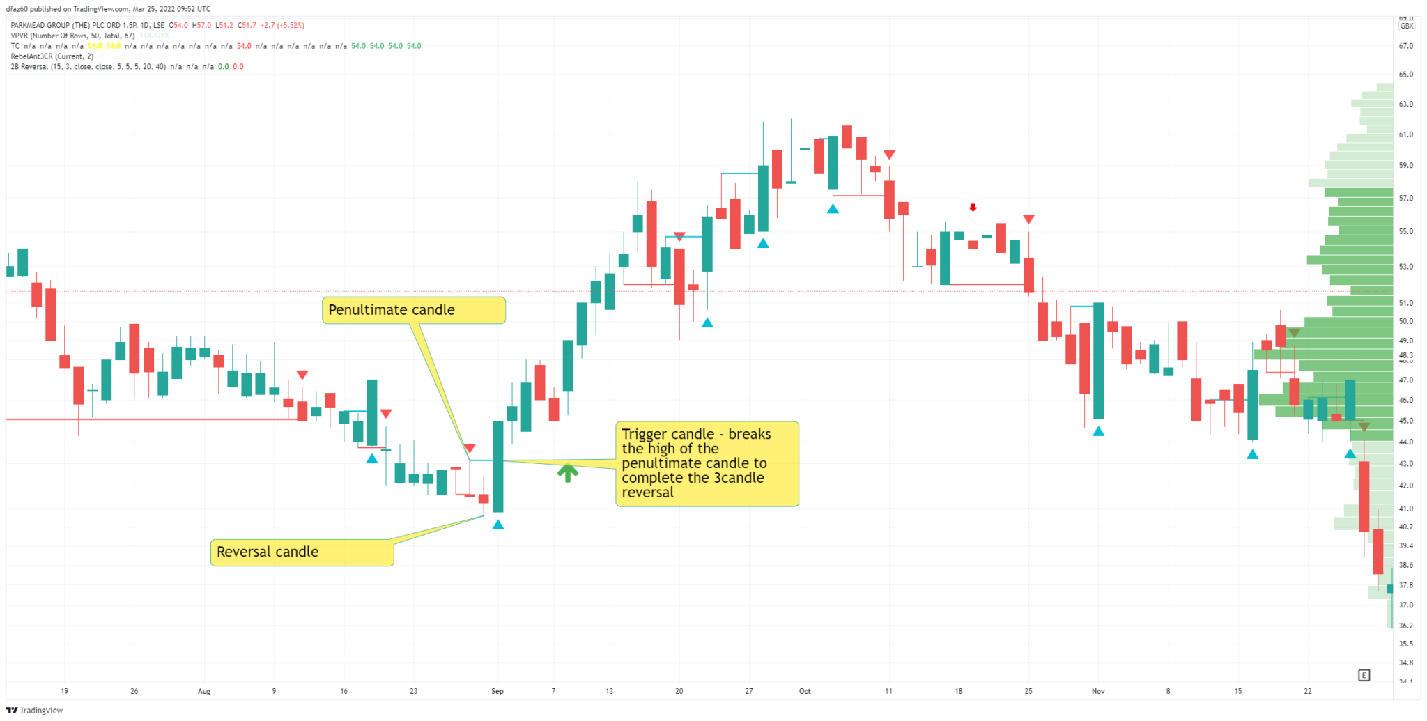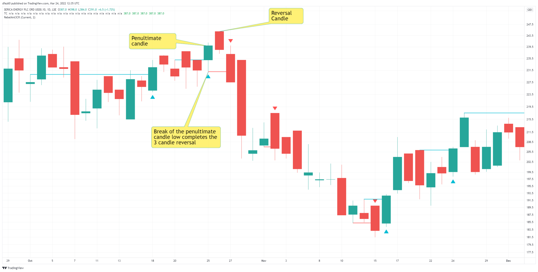 The penultimate candles comes before the reversal candle (lower low or higher high)