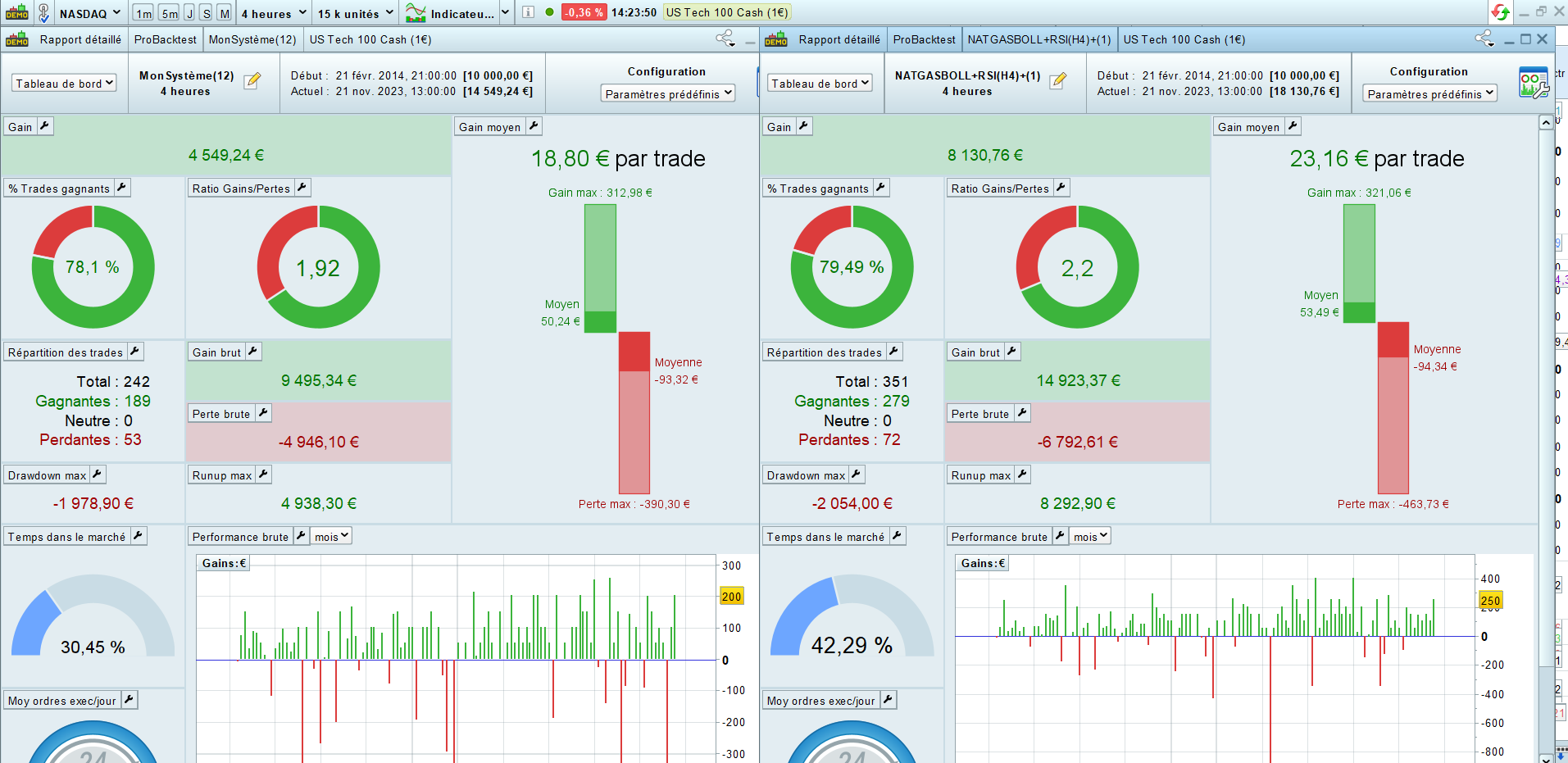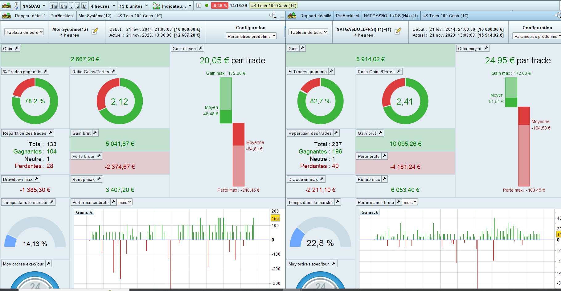 L’image 1 c’est nos codes avec période 3 pour chacun. L’image 2, ce sont nos codes avec période 1. Bref, pour ce cas présent, pas la peine de se prendre la tête, c’est période 1 qui donne les meilleurs résultats. Mais j’aurais bien aimé exploiter la totalité des occurrences et ne pas être limité par une aléa technique. Je vais essayer de coder la condition pour chaque bougie de la période que je veux étudier. Ça devrait le faire.