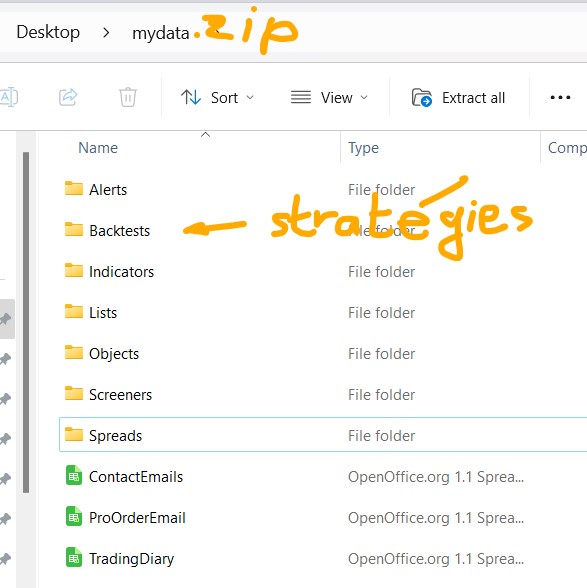 Et c’est malheureusement aussi le cas avec “Exporter mes données personnelles”, c’est sens unique. Ce n’est que une assurance calamité. Vous serez en possession de la totalité de votre propriété intellectuelle, en format texte. Je le fais régulièrement, ajoute la date d’export au nom de fichier. Je dors tranquillement puisque mes centaines d’indicateurs, robots et screeners sont disponible sur mon propre disque de sauvegarde. Ça peut servir aussi si vous cherchez rapido un bout de code, que vous voulez copier/coller ailleurs. Vous le retrouverez plus vite dans cet ensemble avec vos propres outils que par PRT.