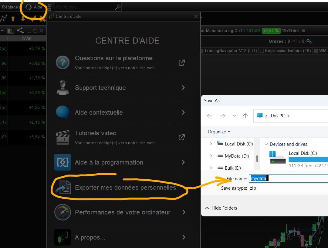 @rouxdan1: Avec ma réponse à Grahal j’ai voulu dire que l’astuce avec “exporter mes données personnelles” ne concerne qu’une aide pour restaurer les codes sources de nos indicateurs, stratégies et screeners en cas de calamité. Et que cela n’aide d’aucune façon en restaurer les stratégies/systèmes de trading en ProOrder si là il y a un problème.