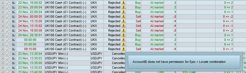 Hi Grahal, I have also encountered this error but only on the demo account- I think I like you found another variation of the instrument. I think the demo account with IG has all variation of one instruments but only some are country applicable. The one you got error on is properly for Asia or something.