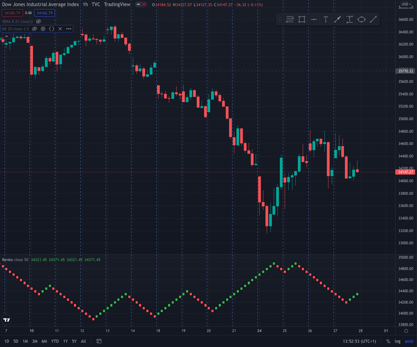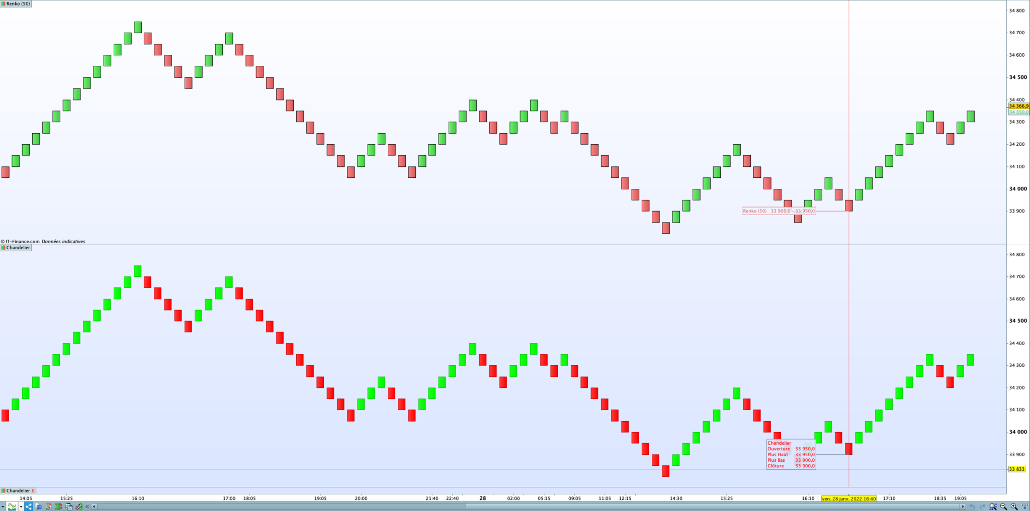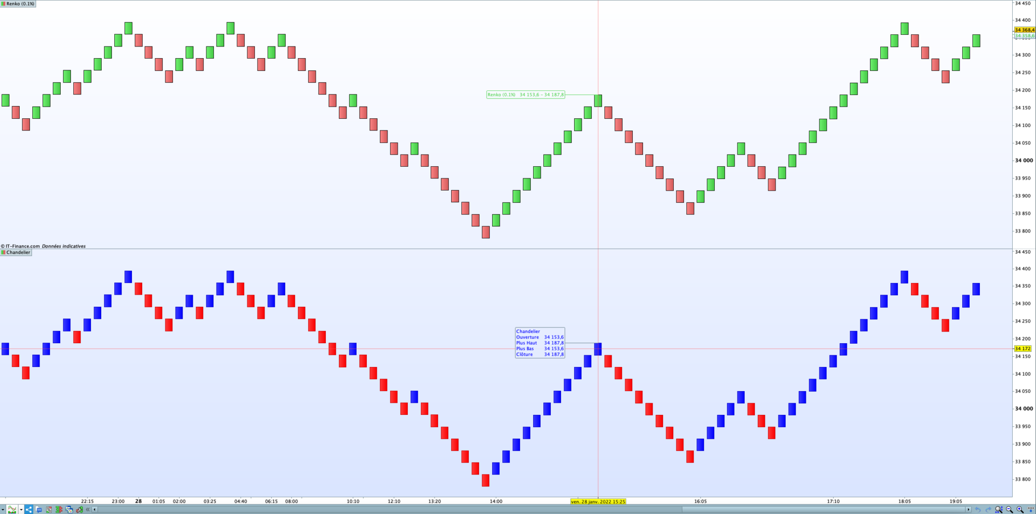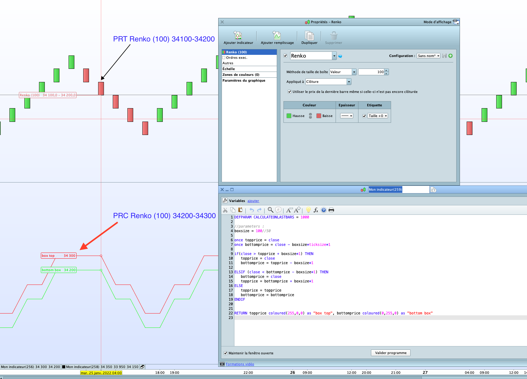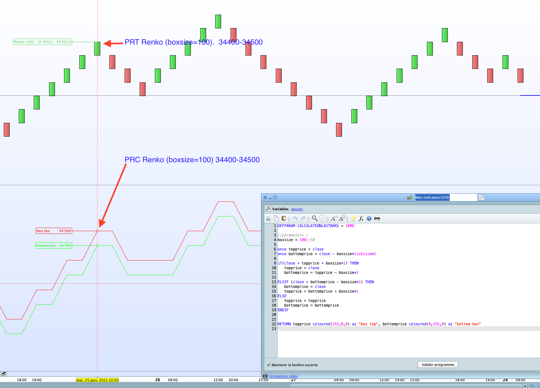 I’m trying to replicate the same Renko as PRT. I chose Boxsize 100 on Dow H1 and used the code provided by Nicolas here https://www.prorealcode.com/prorealtime-indicators/renko-boxes-on-price-chart/