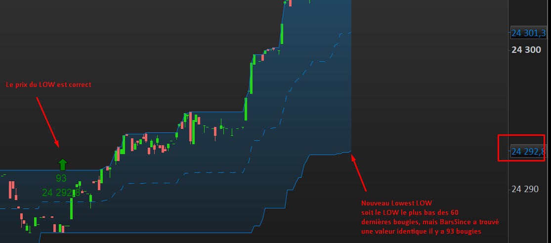 Du coup, quand le nouveau Lowest des 60 dernières bougies est égal à un creux plus ancien, BarsSince peut retourner 93 (ou tout autre nombre > 60), alors que l’extrême de la fenêtre courante est… dans la fenêtre !