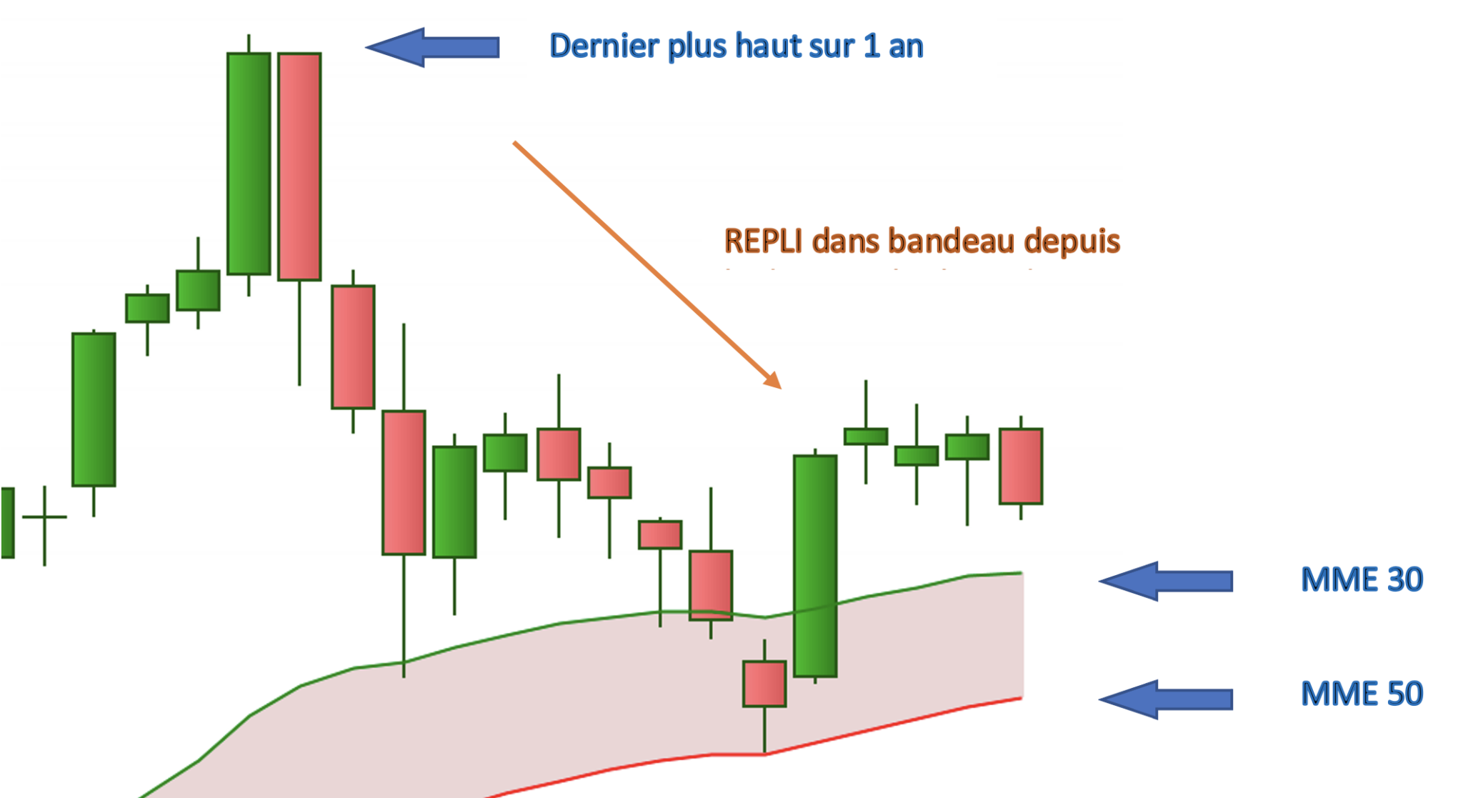 Y aurait-il une âme charitable pour créer le code d’un screener permettant de rechercher des valeurs en hebdo qui ont fait un repli dans le bandeau délimité par MME 30 et 50 depuis le dernier plus haut d’il y a 1 an.