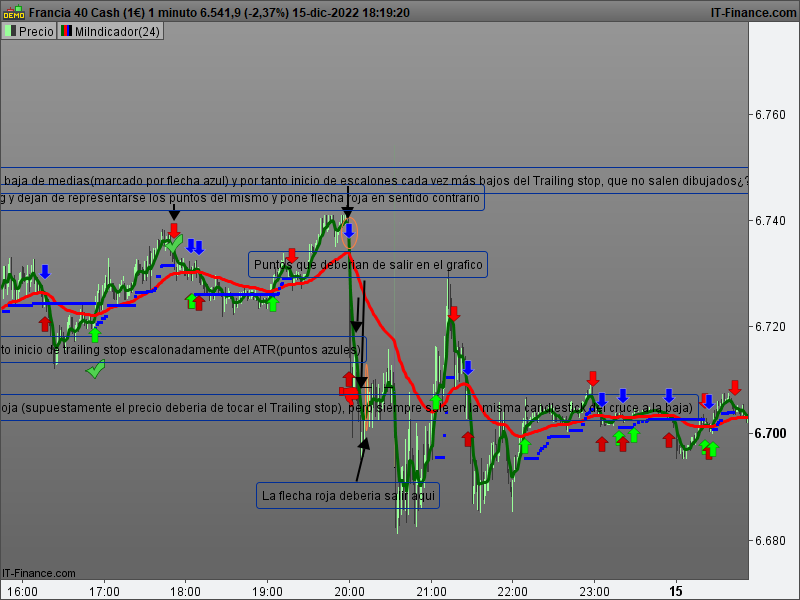 Cuando se cruzan al alza dichas medias, nos lo señalara mediante una flecha (verde) y el indicador aparecerá en el gráfico mediante puntos (azules), en el momento en que el precio sea menor a ese indicador, nos lo señalará mediante una flecha (roja) en sentido opuesto y el indicador ya no aparecerá en el gráfico.