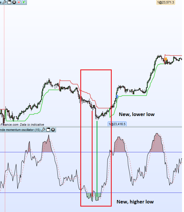 Hi guys. Im still learning here, and wondering if someone could teach me how to: I want to buy if Chanden is setting a higher low, while price is falling and setting a lower low.