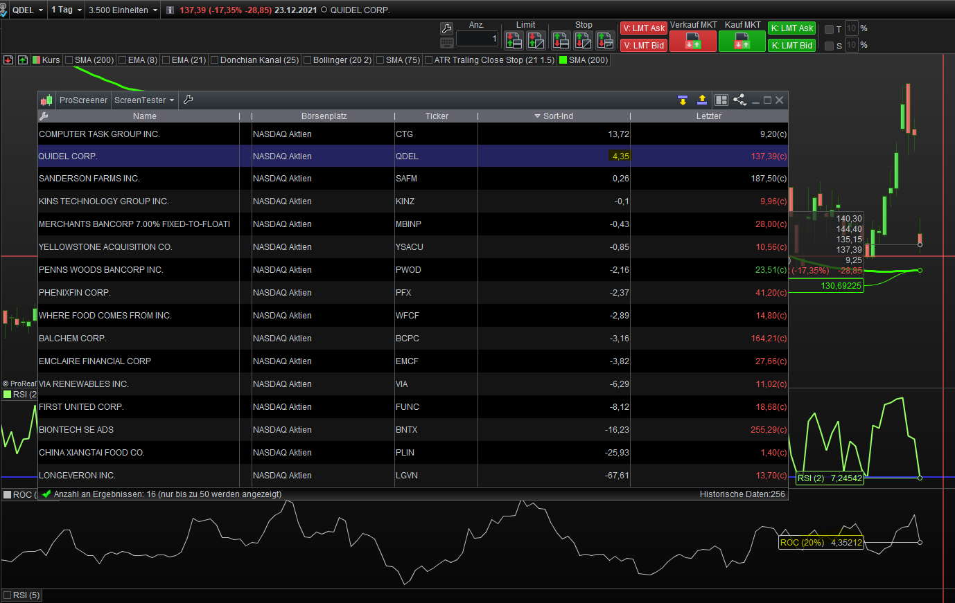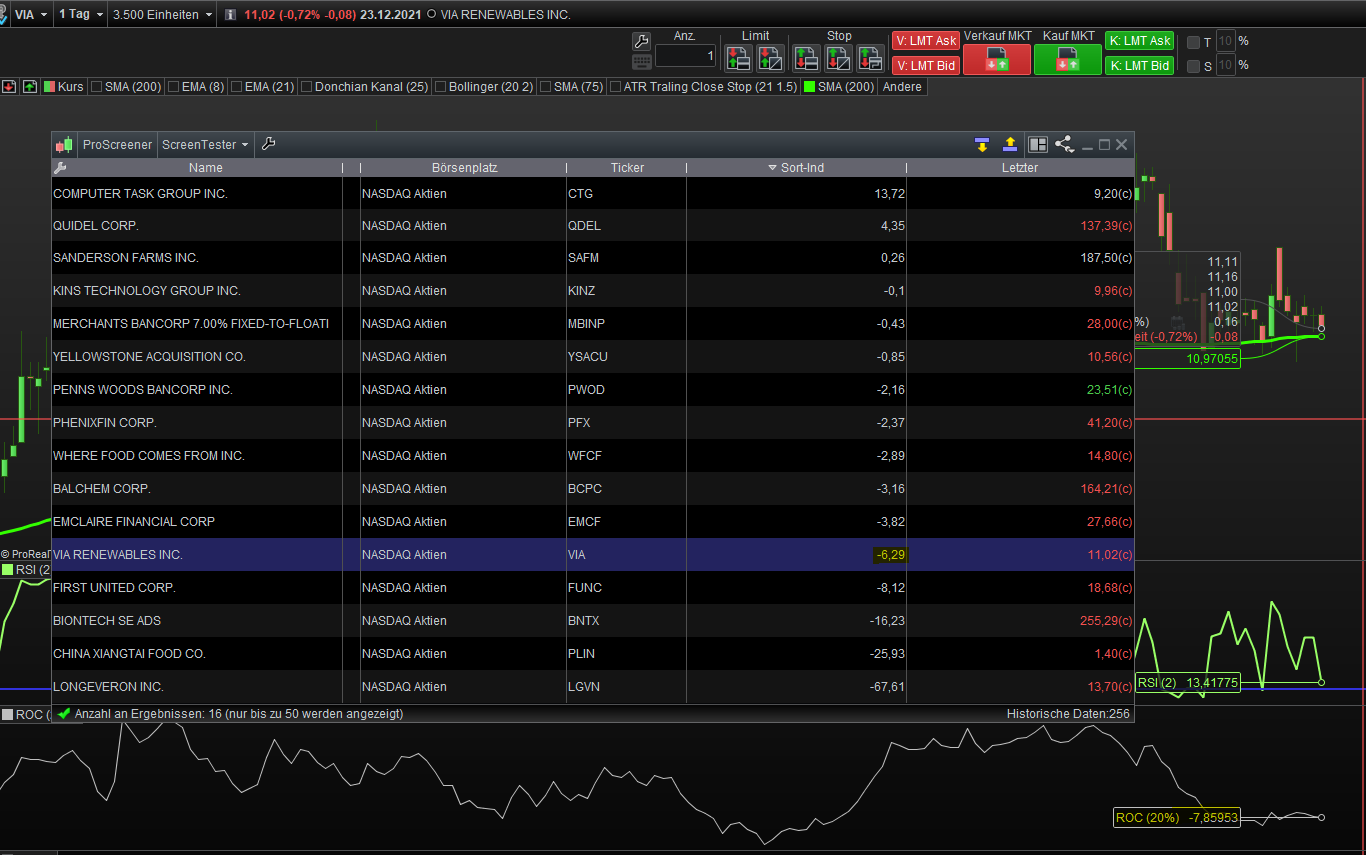 I created a very simple screener that searches for stocks which closes above the 200 SMA and the 2-period RSI is below 15.