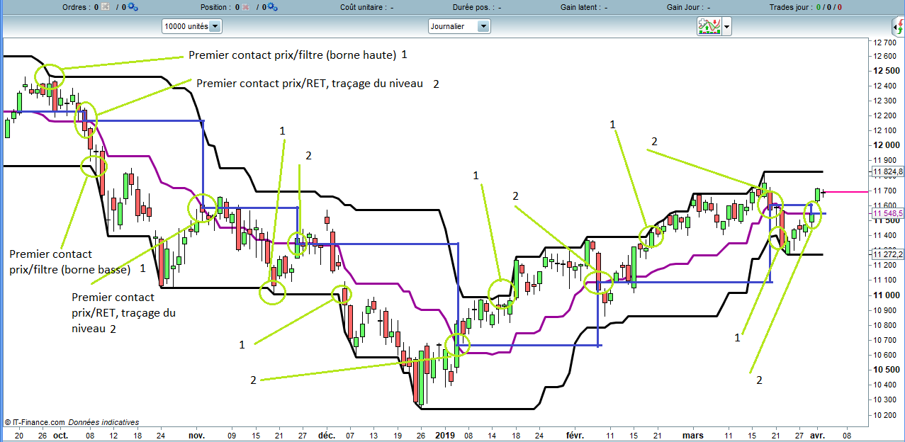 A chaque fois que le prix touche une des 2 bornes haute ou basse, et qu’elle rejoint le centre RET, un nouveau niveau se trace, etc…