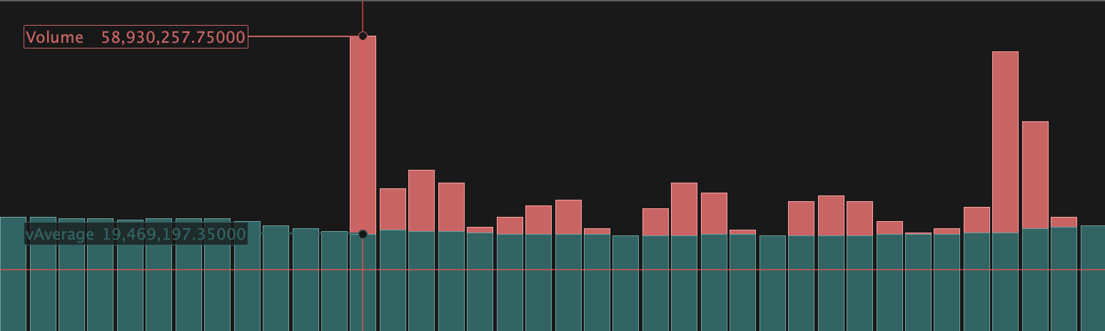 return volume coloured(r, 100, 100) Style(histogram) as "Volume", vAverage coloured(50, 100, 100) Style(line) as "vAverage"