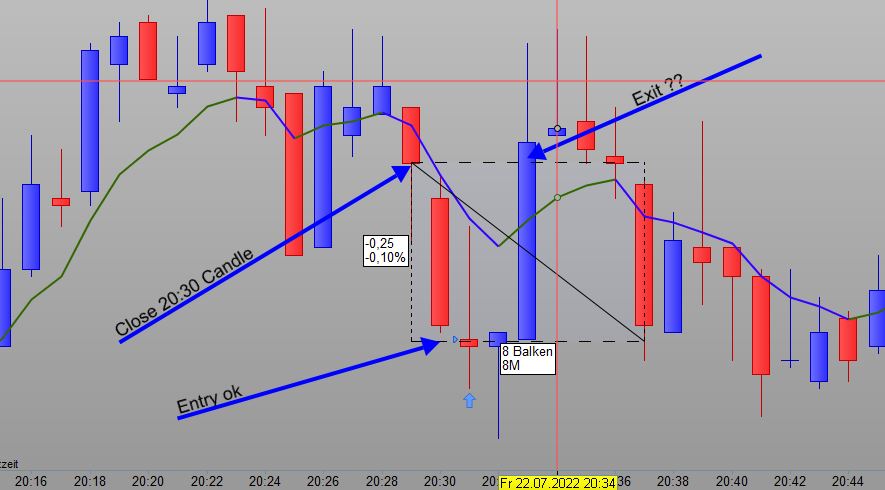 Jetzt möchte ich das das system wieder aussteigt (exit) wenn der Kurs um 0.25 Punkte gestiegen ist, also wieder beim schlusskurs der Kurze 203000. Das haut so nicht hin bei mir.