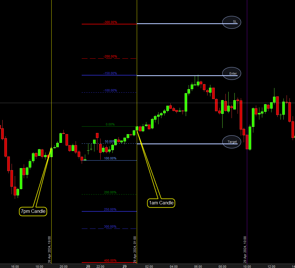 Maybe I didn’t explain it well, so the entry at fib level 150 or 200% as seen in the new pic. Stop at 300% and TP will be in the 50% in that initial range of 7pm to 1am highest close or the open price and the lowest close or the open price which ever has happen! if the trade did not trigger by 10 am should cancel the whole thing.
