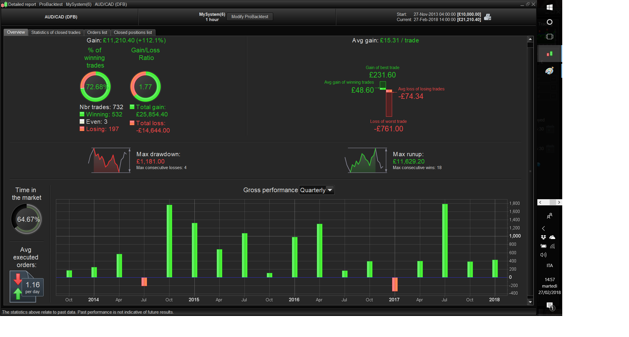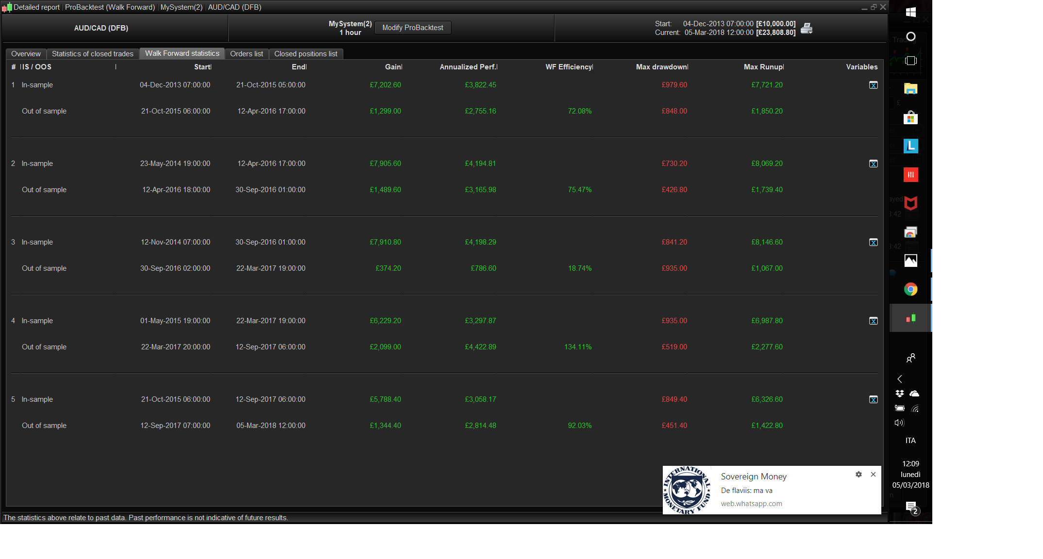 So far for the FTSE with 2 contracts, exposure more than 30.000 GBP (!), it gives interesting profit of 3.900 GBP on the 15 minutes bar chart with 15.000 bars, from an a maximum of one trade per day, from 6 september 2017 till 4 May 2018, with M=1, N=3, L = 50 and S = 40 (also I did no IS/OOS testing so far !!)