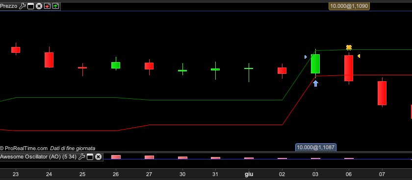 2. adesso che incomincio ad avere un codice di base abbastanza solido su cui lavorare, volevo tornare molto brevemente su un quesito che è diventato (anzi è ritornato) molto pertinente. Allego una immagine dove si vede che il pattern che uso per le mie prove si è correttamente formato il 25,26 e 27 maggio. Nell’attesa dell’entrata long avvenuta correttamente in data 3 giugno al superamento del massimo del 26 maggio, vi sono tre candele (31 maggio, 1 e 2 giugno) che hanno un minimo inferiore al minimo del pattern (candela del 25 maggio). Indipendentemente dal Time Frame e dalla valuta specifica, avrei l’esigenza di inserire nel codice un comando che mi cancella l’ordine pendente se mentre sto aspettando di entrare long si verifica una giornata/candela avente il minimo inferiore al minimo del pattern. (Joe Ross la chiama “nullifying bar” ovvero la barra che scendendo sotto il minimo del pattern fa azzerare tutto).