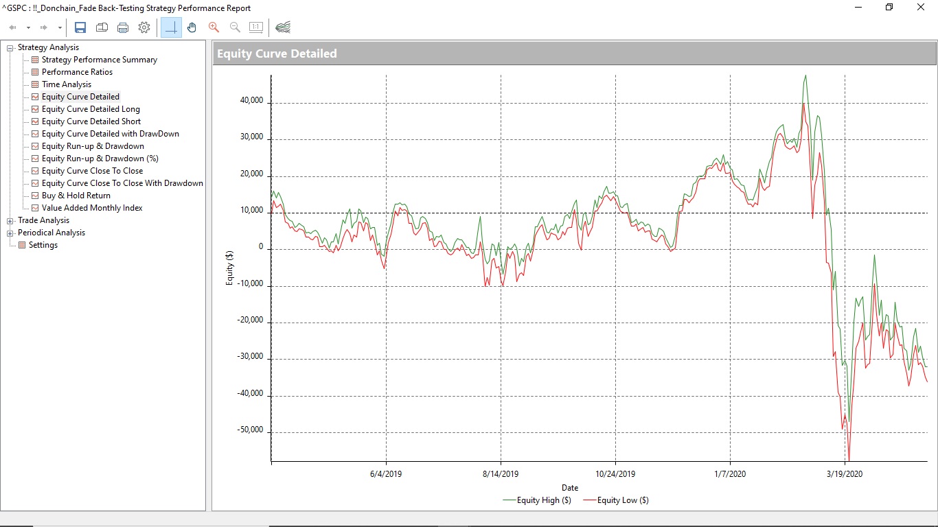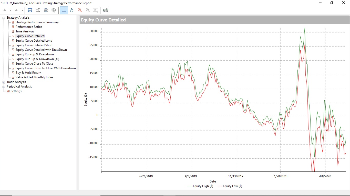 I tested this strategy on daily S&P 500 and Russell 2000 over August 2008 to date, and January 2019 to date. The equity curves are attached. There are probably enough wins fading 16 Period Donchain here to lure an unsuspecting trader?