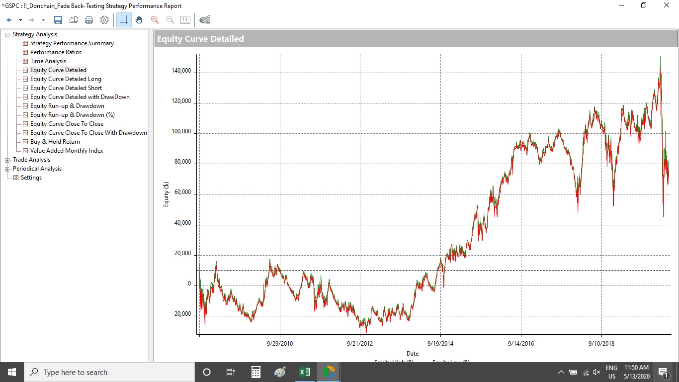 - I completely miss the why the closing S&P prices falling within Keith’s range 81.33% of the time, and the Donchian Channel’s range 76% of the time during a 75 days period may be significant. Should not the pertinent question be what profit accrued by selling at the top end of the 16 period Donchain and buying at the bottom end of the 16 period Donchain?